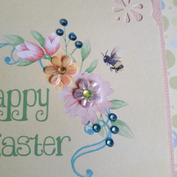 An Easter card with a pretty flower filled parasol, and a "Happy Easter" sentiment in the centre of a swirly blue frame, the frame is embellished with more flowers to which I have added sequin flowers and gems, there are 2 bumble bees flying around the flowers.
