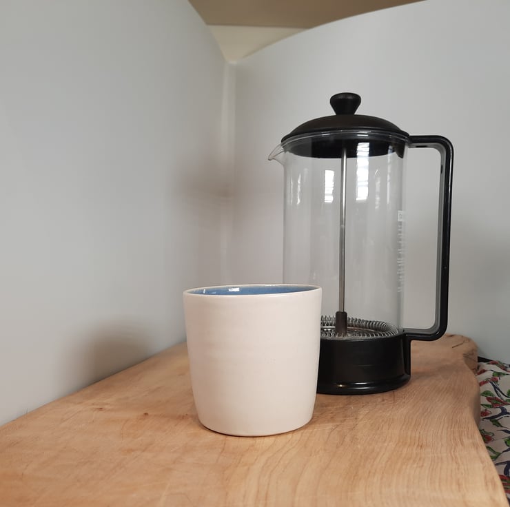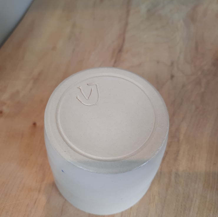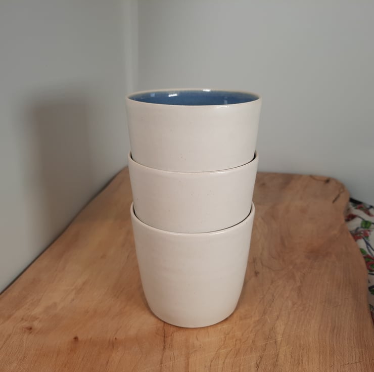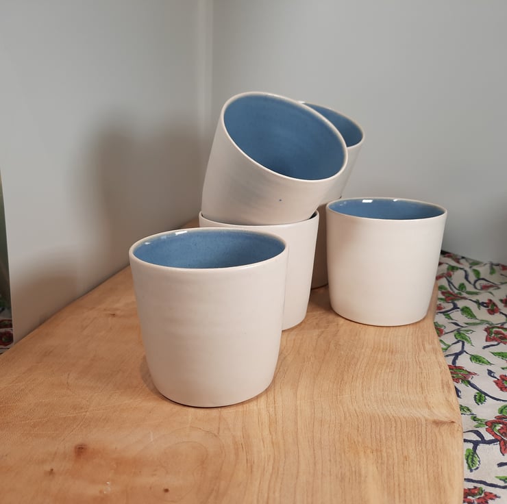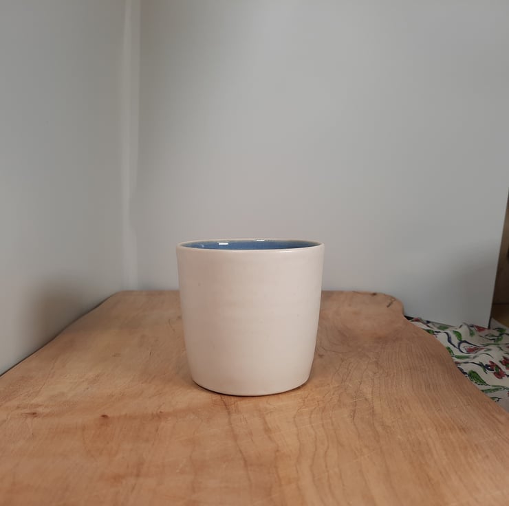 A glossy blue grey and satin white hand made tumbler or beaker.