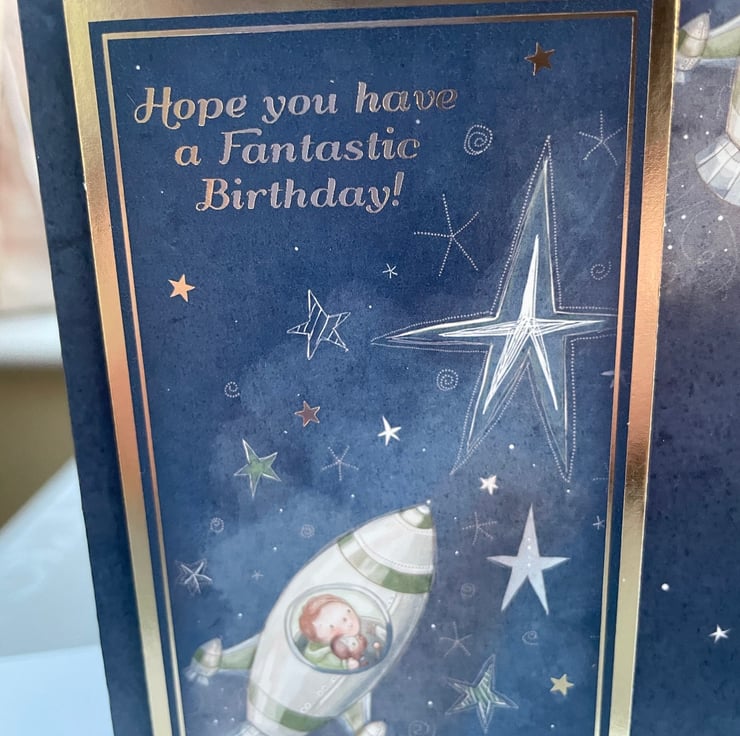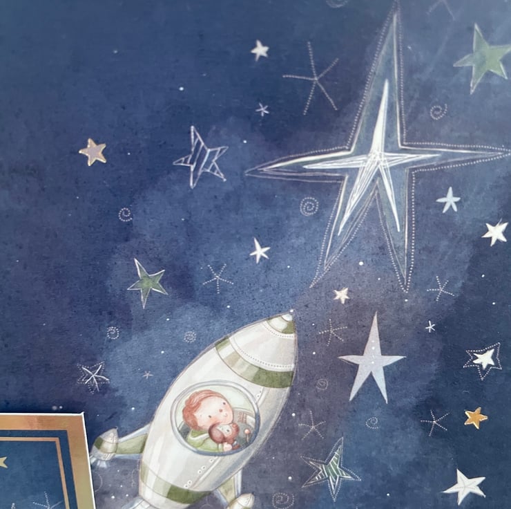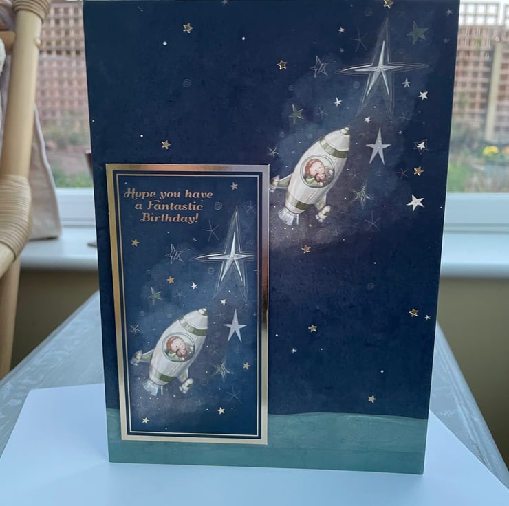 A beautiful and dreamy birthday card for a little boy. This A5 sized card is all about space. The main card features a space scape with gold and white stars. A green landscape is at the base. A little boy is an a spaceship and is shooting for the stars. the topper is matching and has the greeting Hope you have a fantastic birthday. Inside the card has an insert that says Wishing you a happy birthday.