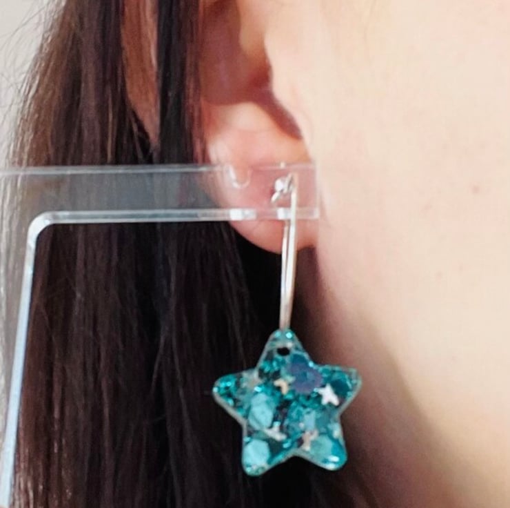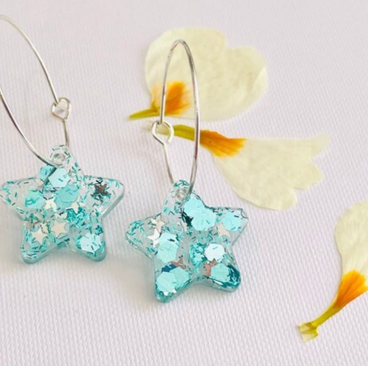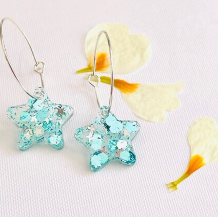 Funky hoop earrings with a resin star charm. The resin has been coloured with a turquoise glitter mix The hoops are silver plated metal.