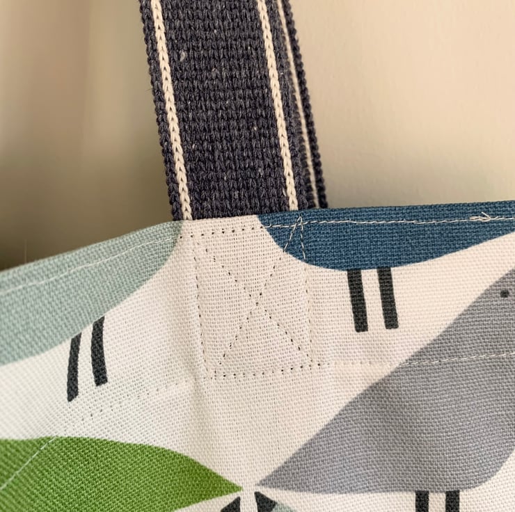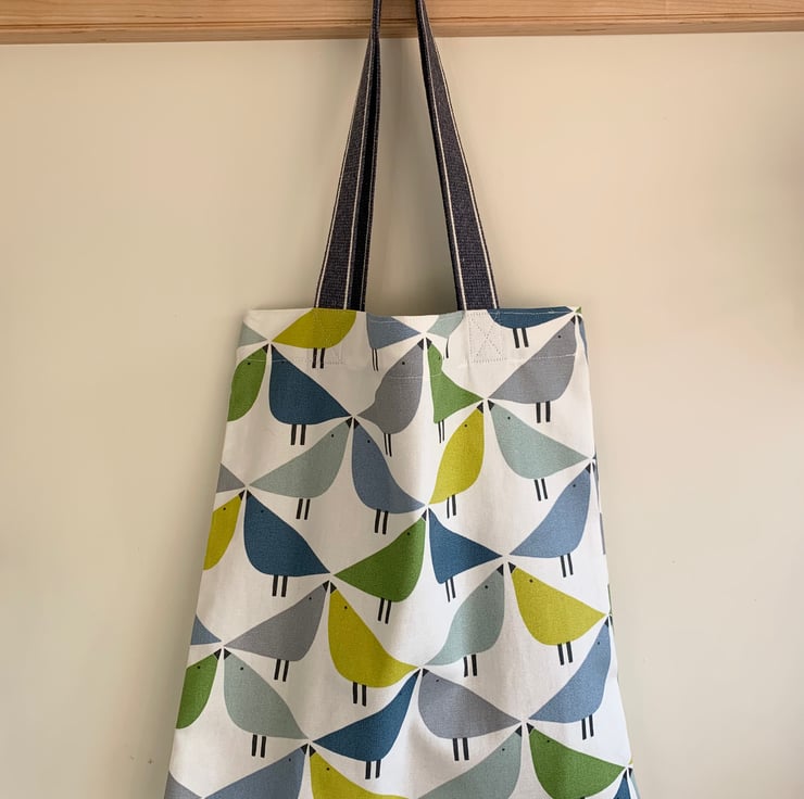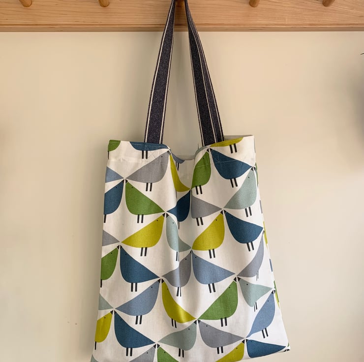 Tote bag made from Scion Lintu cotton with geometric bird design in shades of green and blue on a white background. The bag has long blue webbing straps which can be worn on the shoulder.
