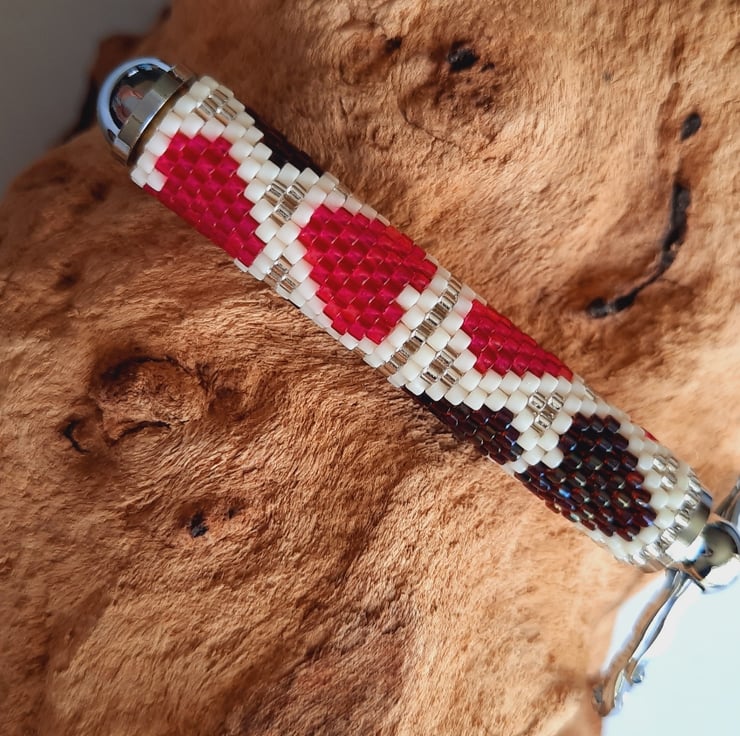 This lovely beadwork keyring is made using Japanese delica beads which have been stitched into a heart design. The keyring finding is silver tone and approx. 9cm in length and the ring at the top has an outside diameter of approx.2.7cm. It is fairly light weight and will come in a little organza bag.