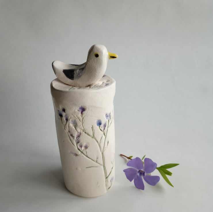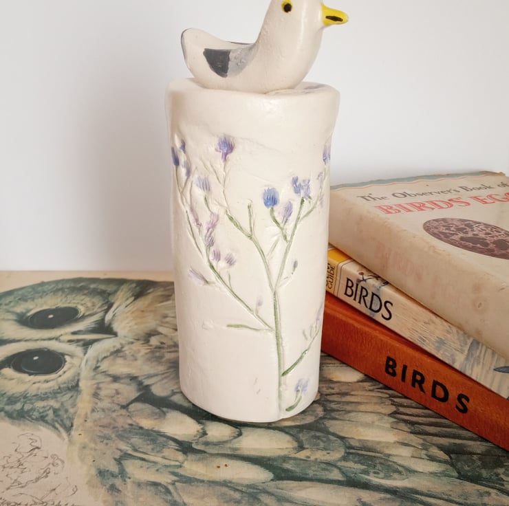 This is a cute seagull perched on to a ceramic plinth with flowers painted on.