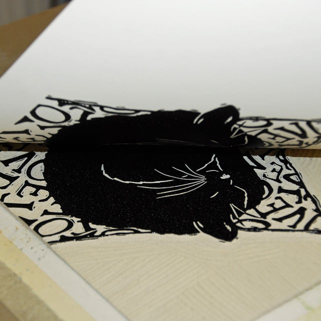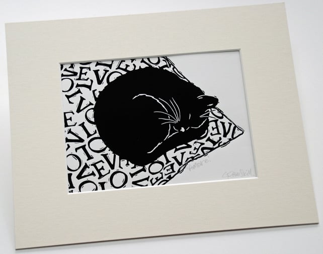 Black Cat Linocut Print, titled 'Amore'. Original, hand cut linocut, printed in black ink on hand press. Signed and titled in pencil by the artist.