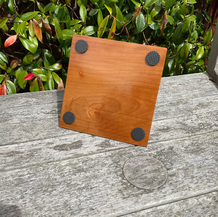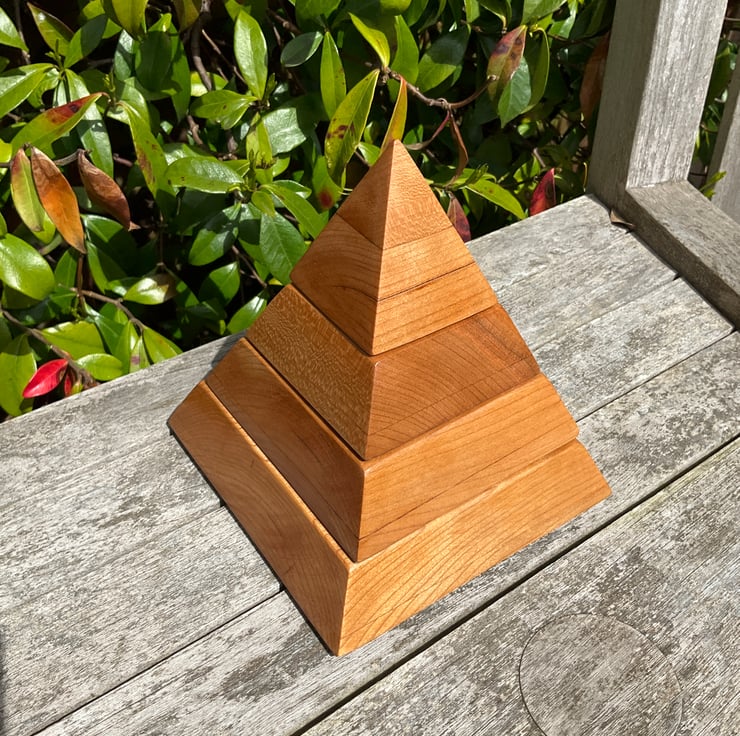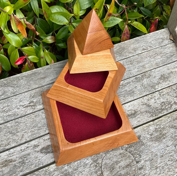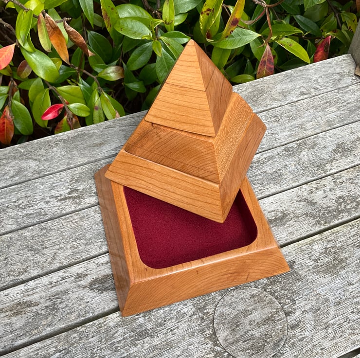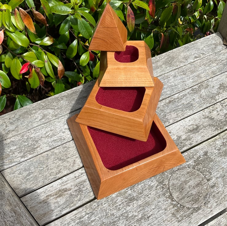 A very stylish and unusual jewellery box which is both ornamental and functional which would grace any dressing table. The box is designed as a pyramid which swivels revealing three draws. The box is made from cherry wood, finished in a durable drying oil providing a deep satin sheen The pyramid draws are lined in a contrasting black flocking.