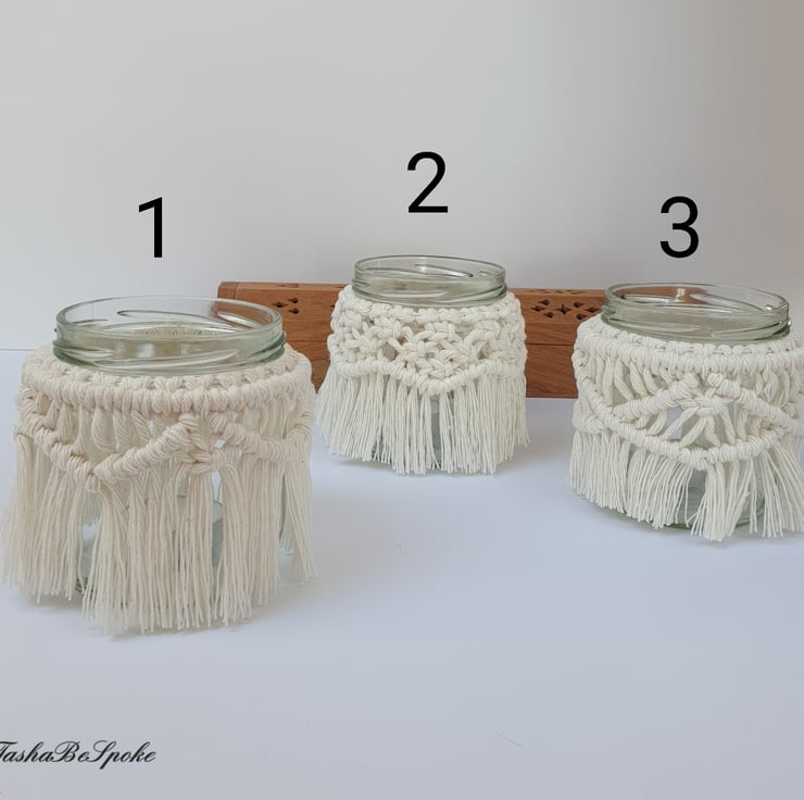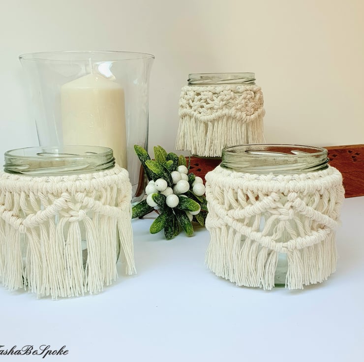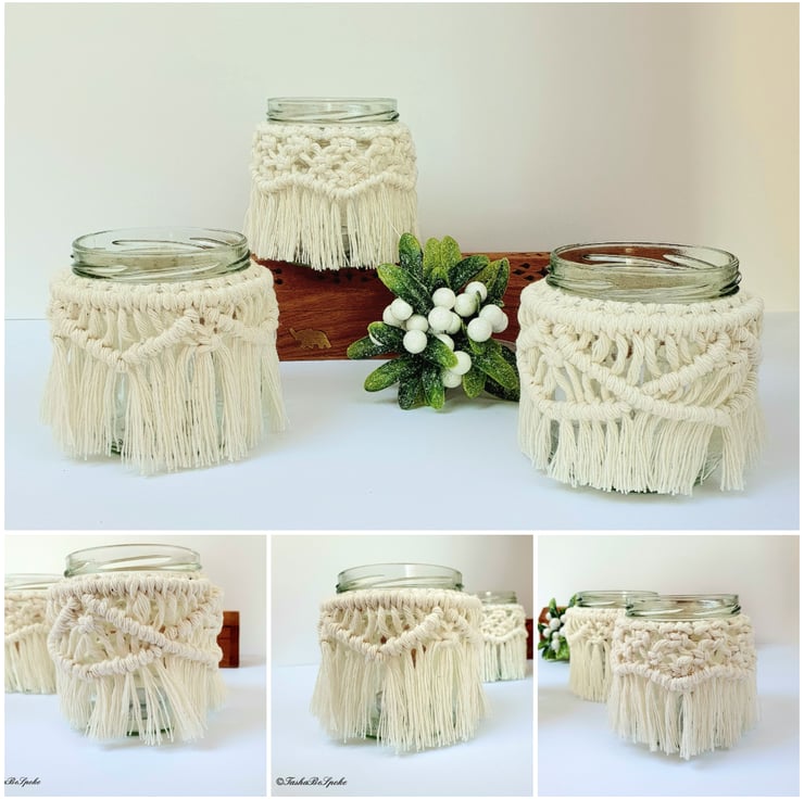 Handmade macrame jars covers available in 3 bohemian styles. These lovely Macrame jars can be used as vases, candle holders, storage jars or beautiful home decor.