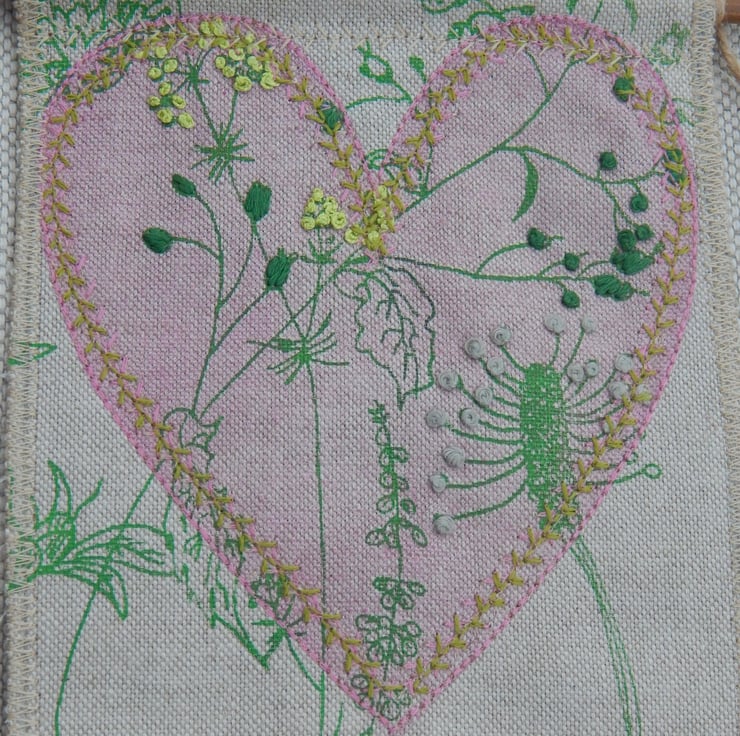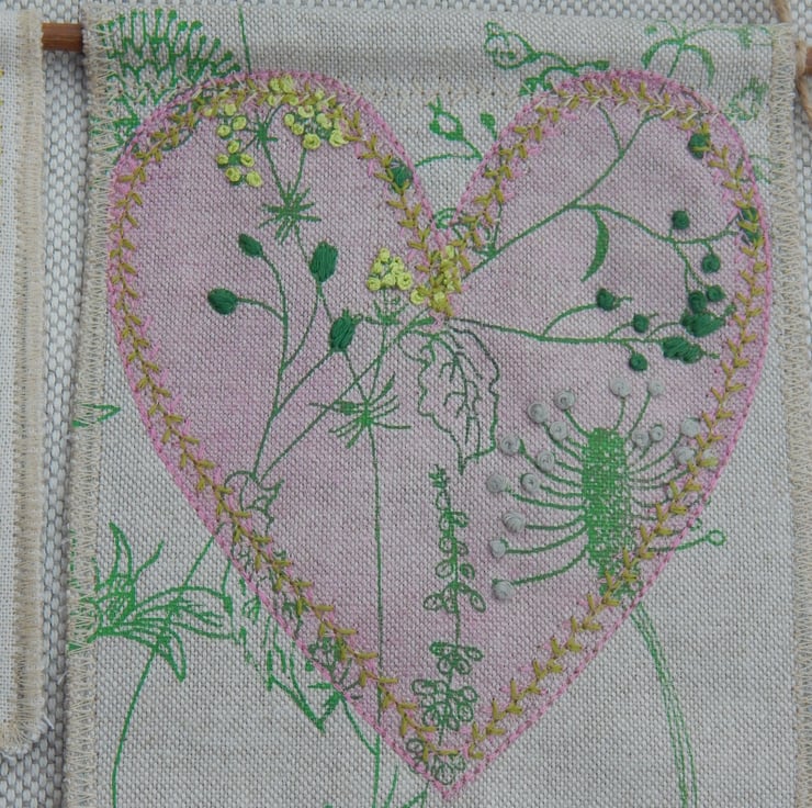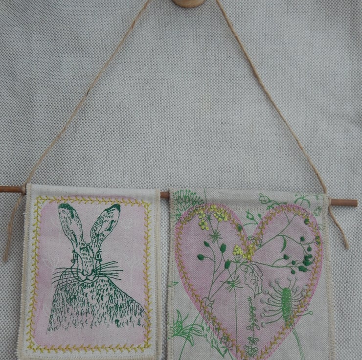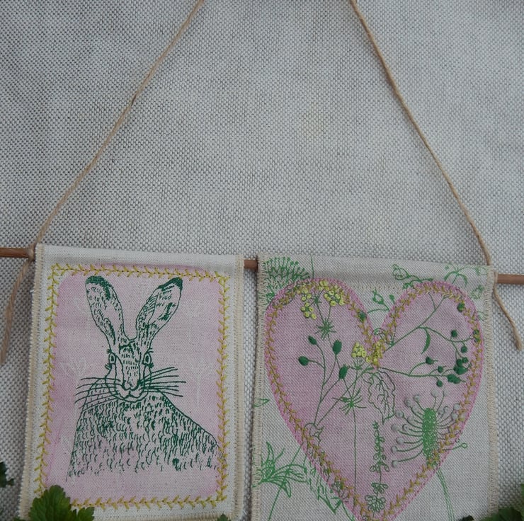 This is a hare screen printed onto a simple deep pink lino print, on a piece of medium weight cotton. This has a couple of layers of cotton fabric for some stability and this is sewn onto a piece of willow, a simple hanging loop is made with a piece of hemp string connected from one end of the willow to the other. There is also a screen print of hedgerow flowers with a heart lino printed, some of the flowers have hand embroidery for a pop of colour.