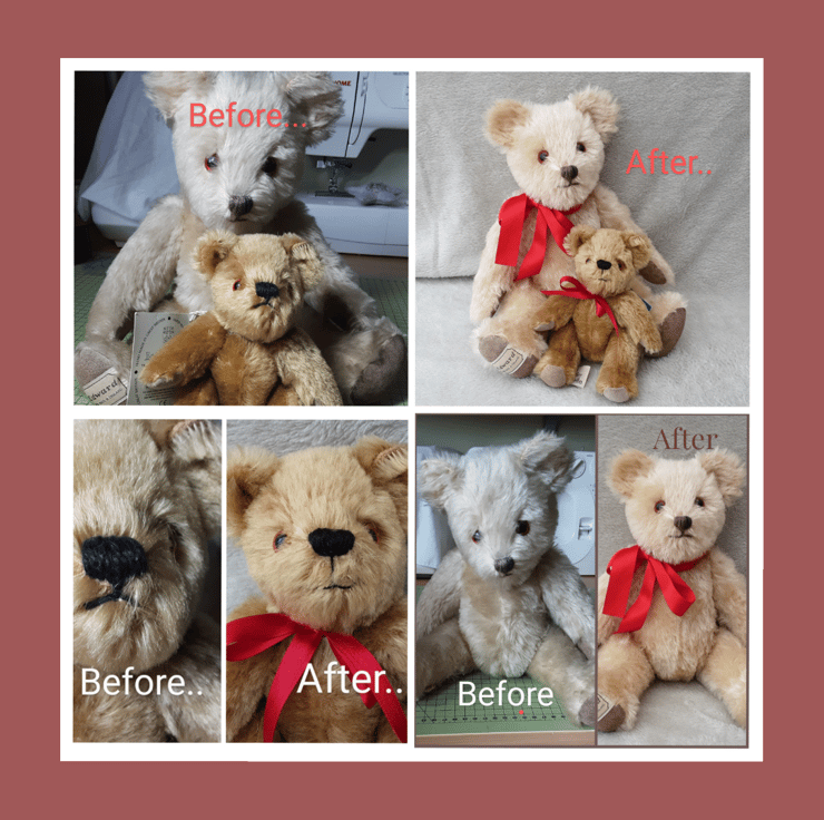 There's something very satisfying about bringing an old worn or dirty teddy bear back to life and giving him back his smile. I've done quite a few bear restorations from fairly simple facial details to full body and limb repairs, cleaning and repairing.,