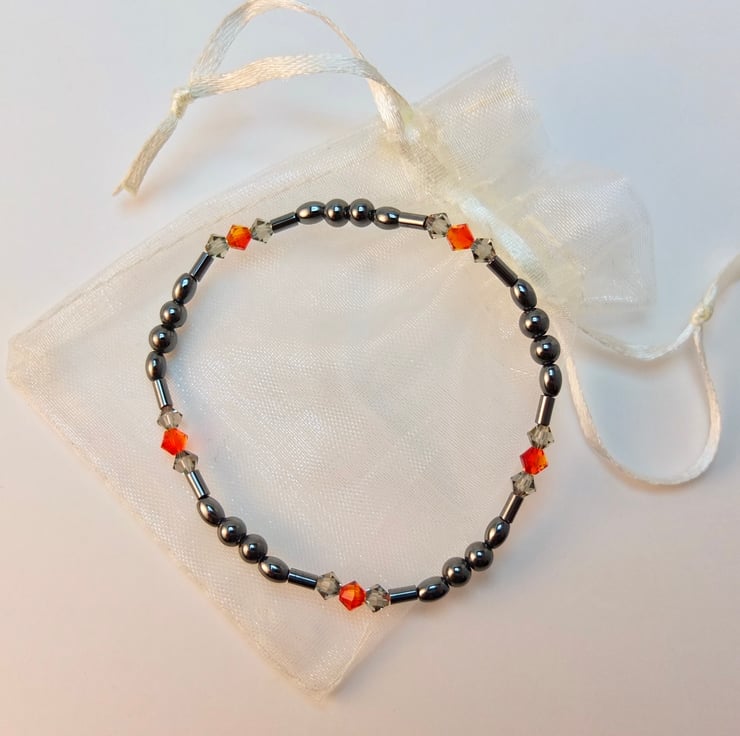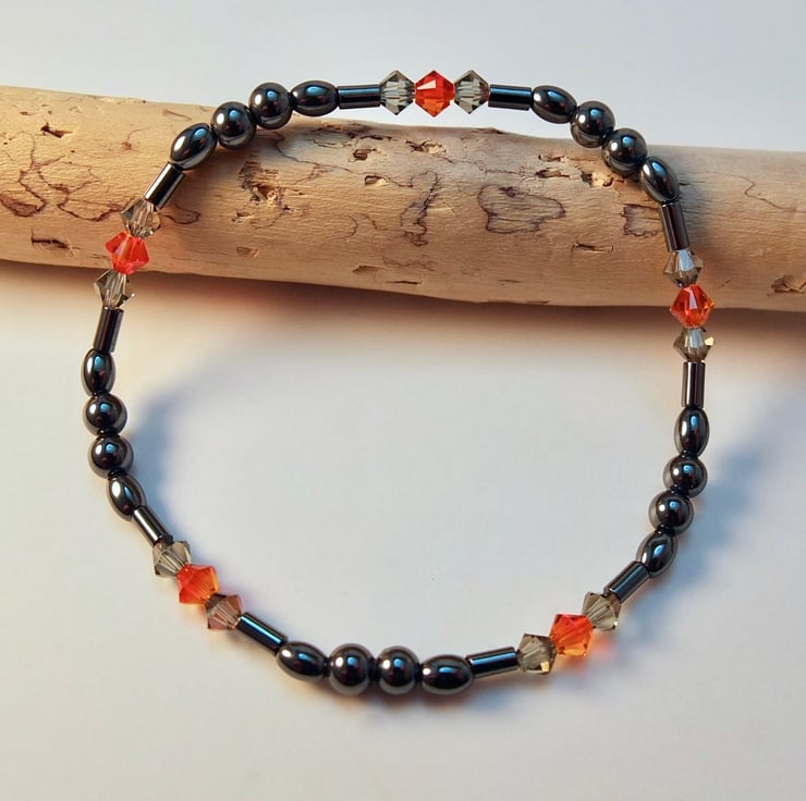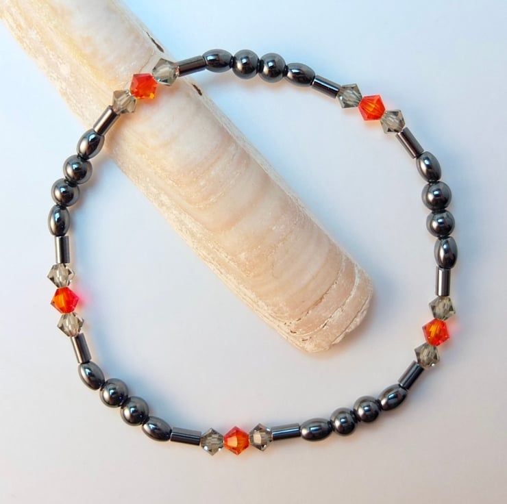 Dainty, sparkly bracelet of 4mm round, oval and tube shaped hematite beads, embellished with 4mm glittering Swarovski crystals in the colours "black diamond" and "fire opal".
