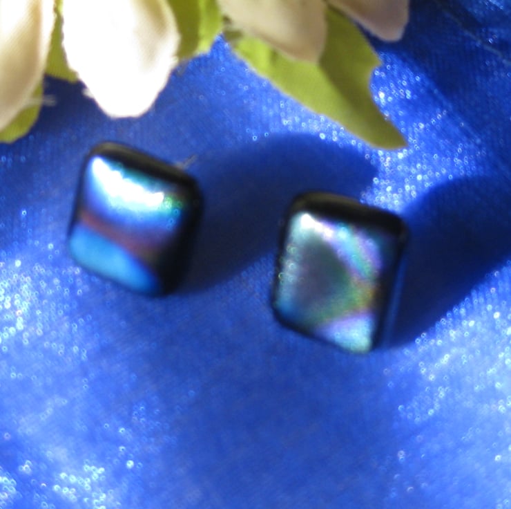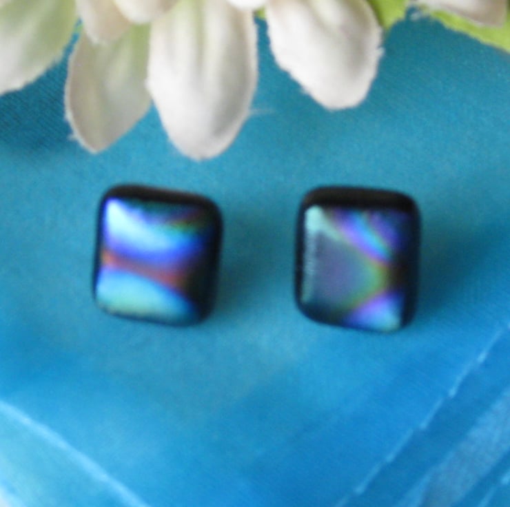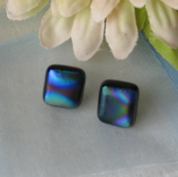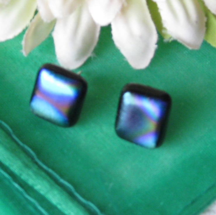 A pair of fused dichroic glass stud earrings. Peacock colours - blue/green/black.