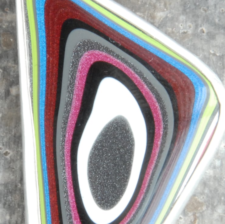 Not come across fordite before? Its layers of over spray paint that builds up in spray booths at car factories, the build up gets baked in the curing ovens in between each layer of paint giving a hard material that can be cut to show the many different colours in it. This particular material came from Jeep's factory in Toledo in 2021 and I cut and polish the material myself, I have matched the colours to the paint charts and the green is called 'gecko green' and the pink is 'Tuscadero pink' (they were both limited edition colours only produced in 2021). I have quite a stash of fordite from different factories so if you love the idea of fordite but want something else then drop me a message as I can probably help