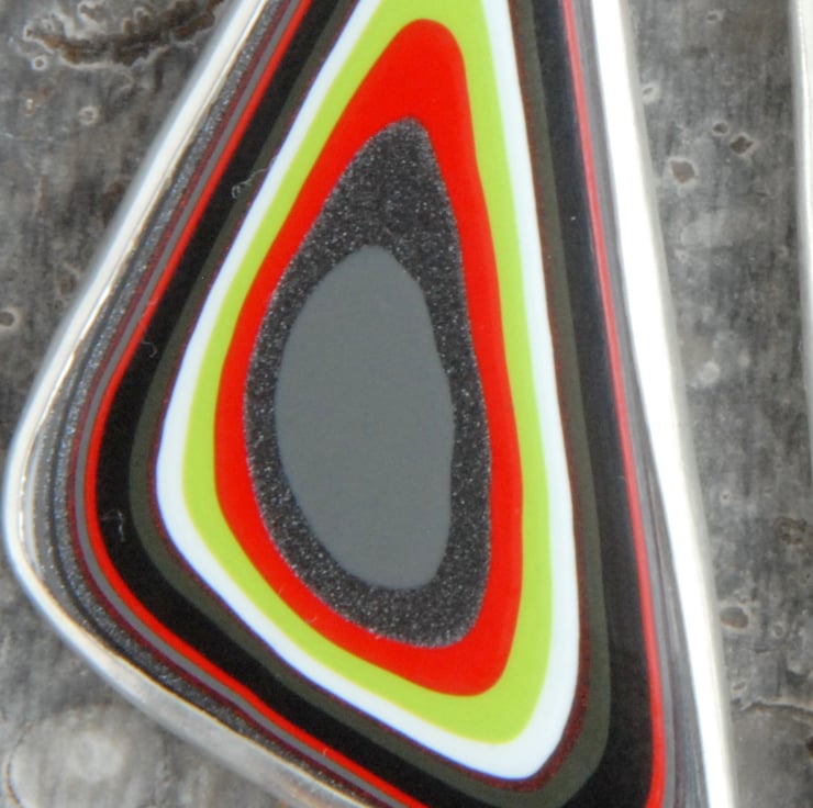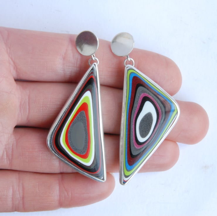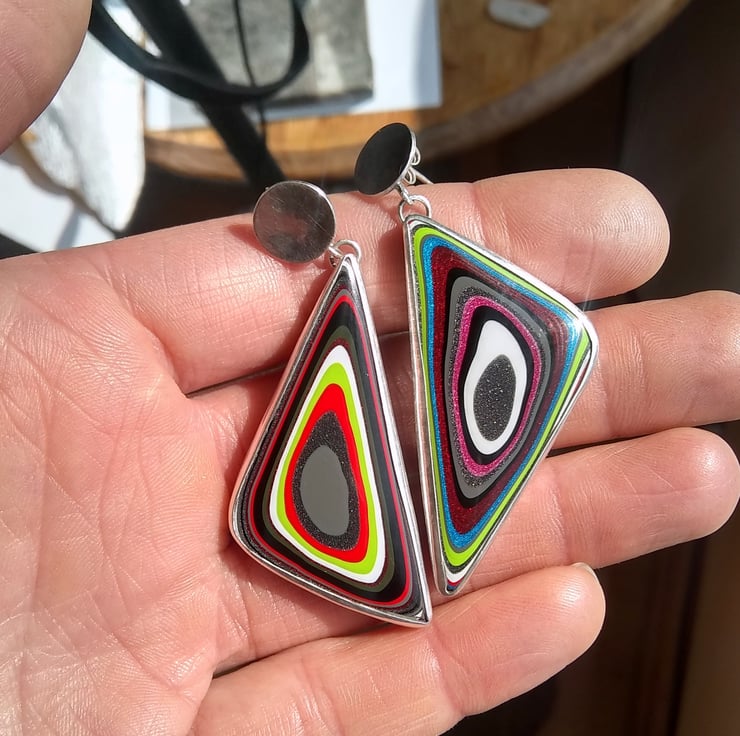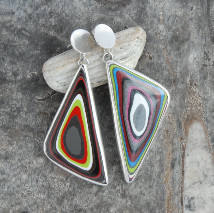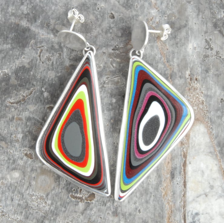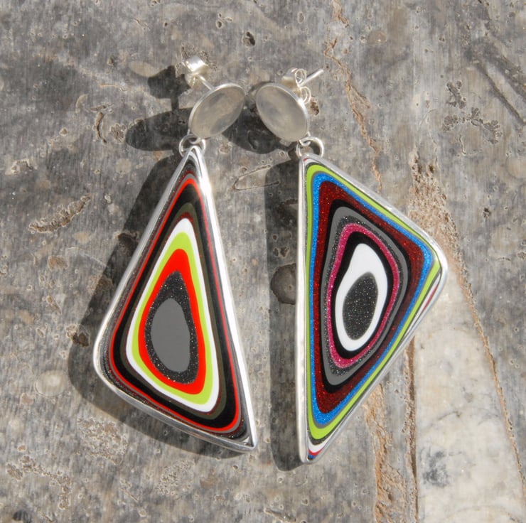 These eye catching earrings will make quite a statement as they feature vibrant triangular drops of super sparkly fordite hanging from a sterling silver post fitting. These fordite earrings are also large (approx 60mm by 23mm) but fordite is lightweight. The fordite is a deliberately mis matched pairing to give an asymmetric design which is further highlighted by having the triangles hanging in opposite directions to each other, one of the earrings has a rings of pink, green, blue and white whilst the other is sparkly grey, red, green and white. The fordite is bezel set in sterling silver and the earrings are finished with silver discs hiding the post and scroll fitting (also sterling silver)