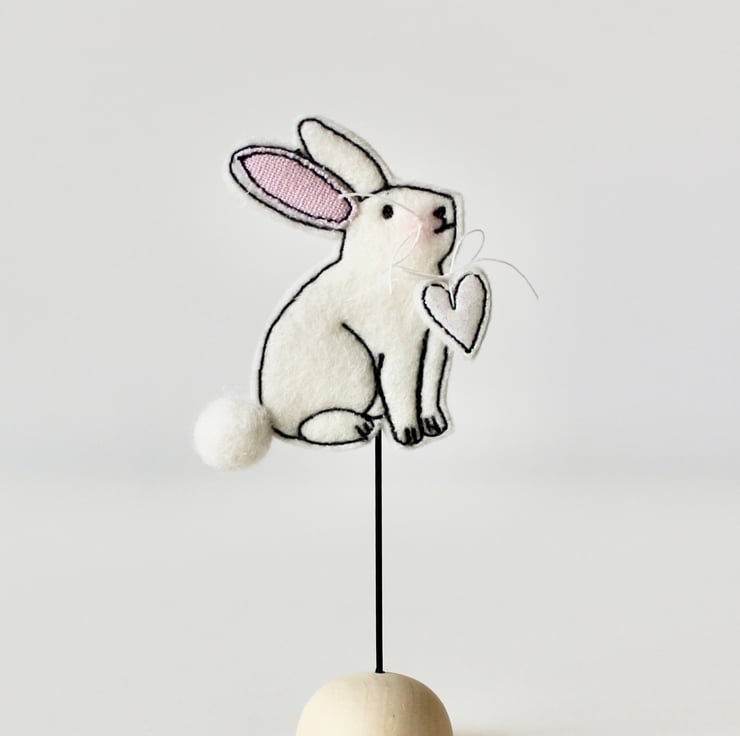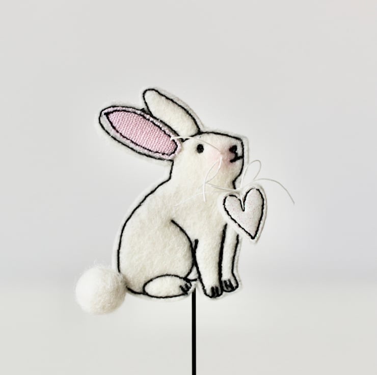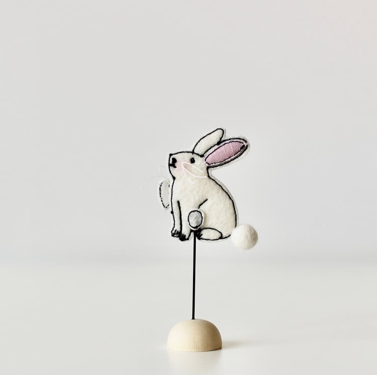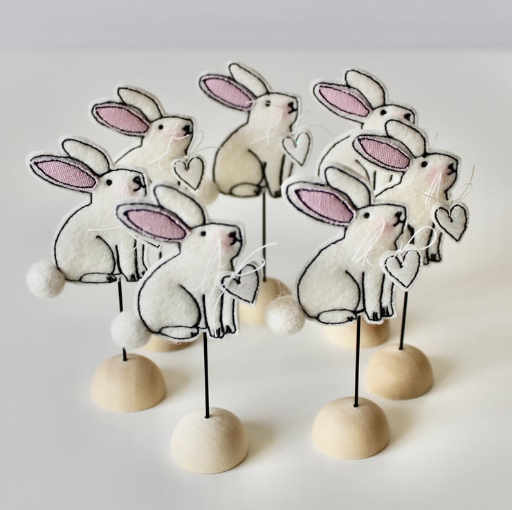 Bunnies are sewn using 100% wool felt, cotton cloth, glitter cloth and free hand machine embroidery; multiple layers of cloth are sewn together and cut out by hand using sharp scissors.