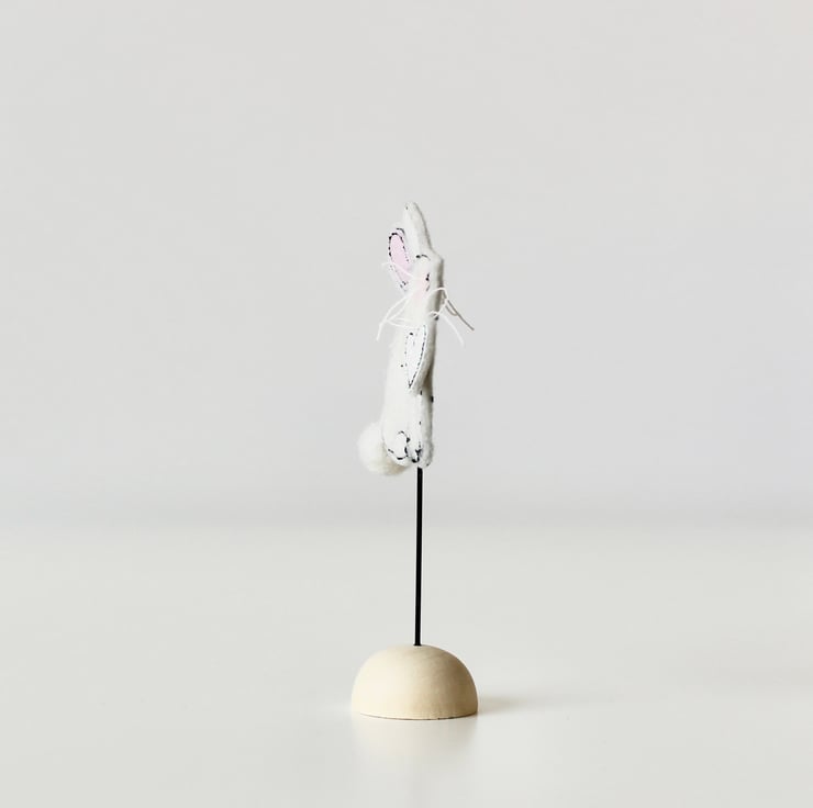 With linen whiskers, a handmade woollen ball tail and mounted on a 1.5cm wooden half sphere (which can adorn a mantle piece or any flat surface).
