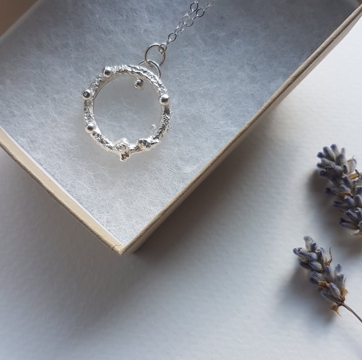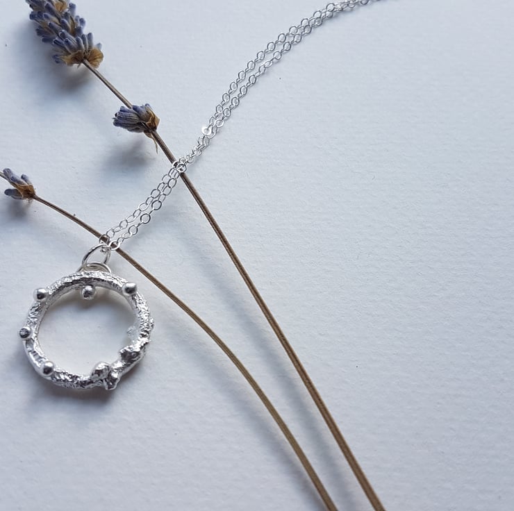 This bobble necklace is made by melting and fusing recycled sterling silver into an organic shape. I've then fused some fine silver bobbles onto the piece to make it sparkle. It measures 2cm in diameter and hangs on a sterling silver chain made from 100% recycled silver. The chain measures 40cm or 16". It's a real one off piece that makes any outfit sparkle.
