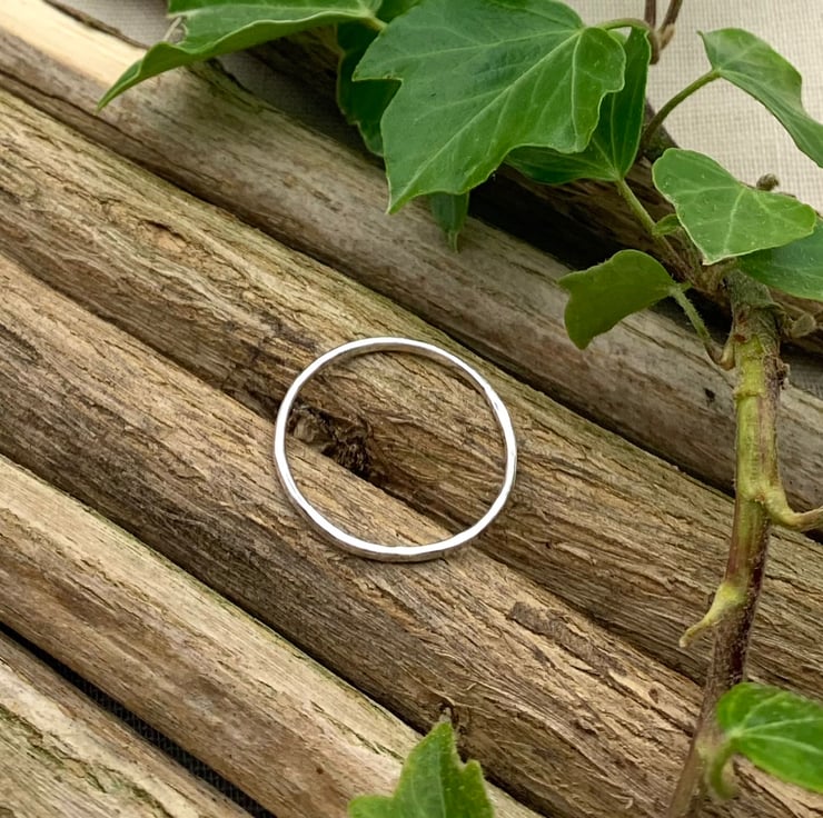 A beautiful handmade sterling silver ring with a lightly hammered finish which gives a unique faceted pattern to each ring. The ring is finished with a mirror polish to ensure that it reflects every morsel of light.