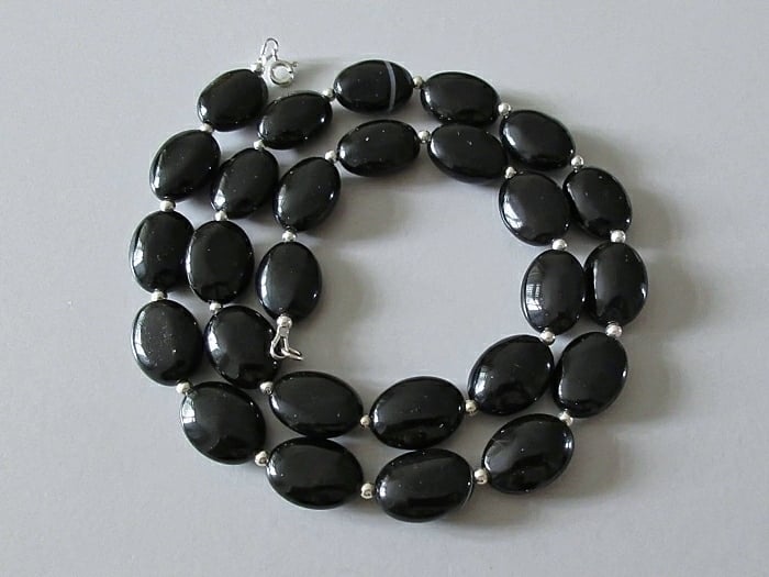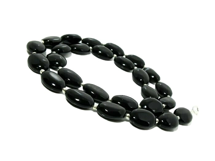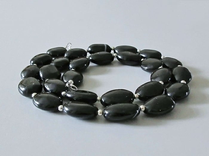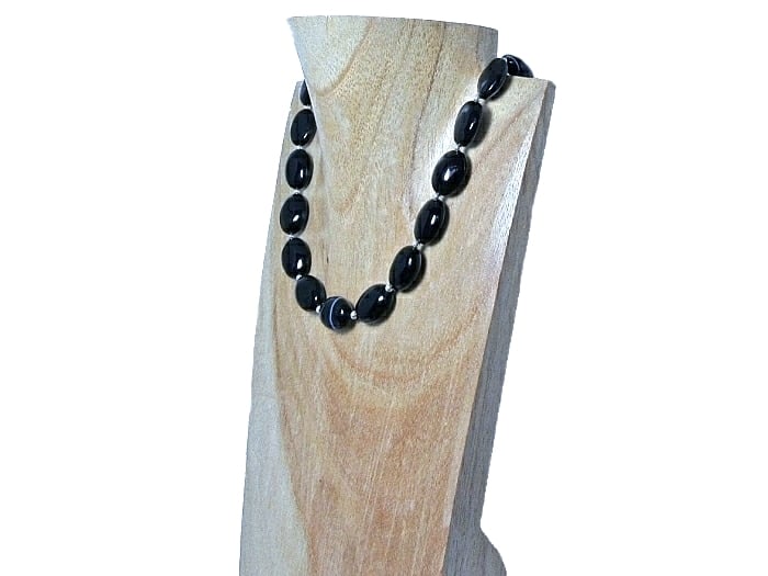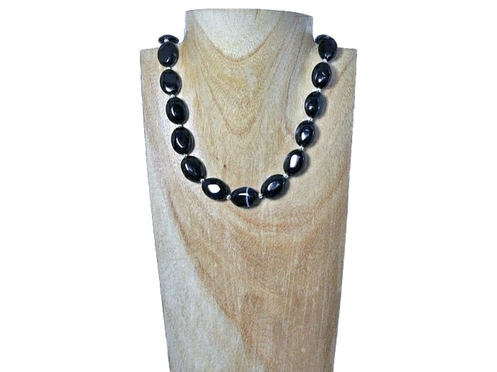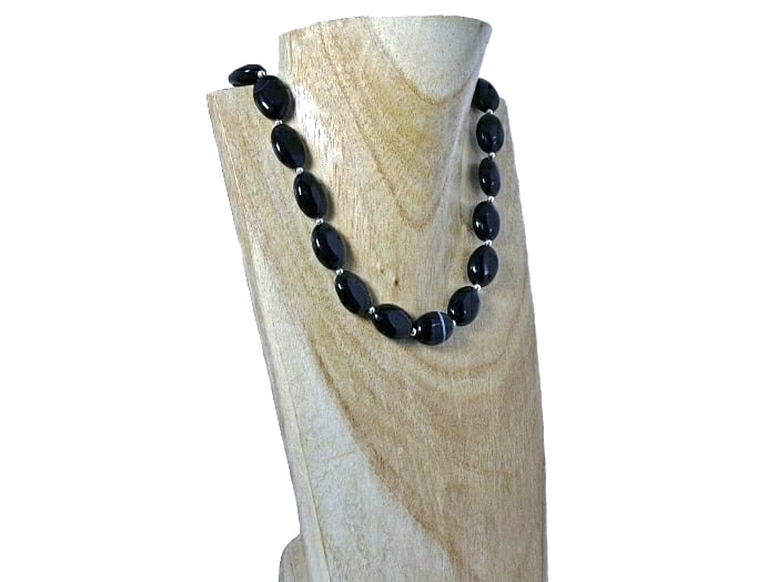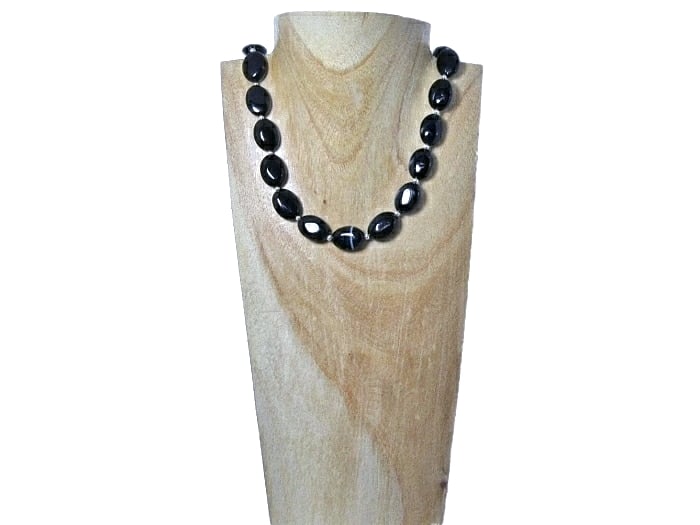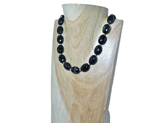 Glossy Black Agate 18mm a 13mm flat oval beads feature in this medium chunky statement necklace.