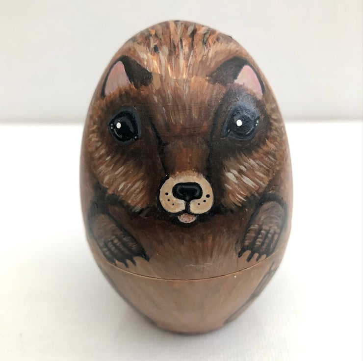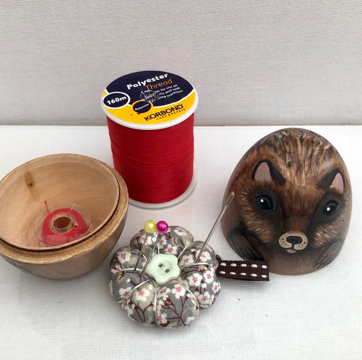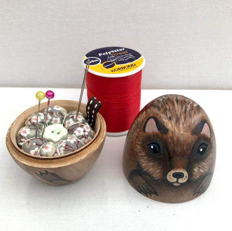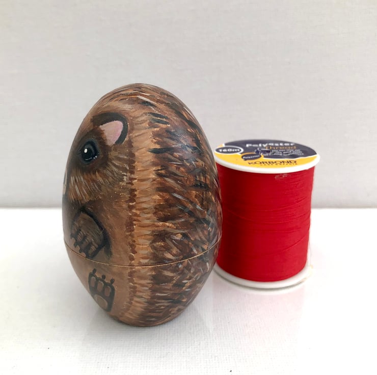 This prickly character has been hand painted on to a soft wood egg , which opens up to reveal a little pin cushion and small storage space.