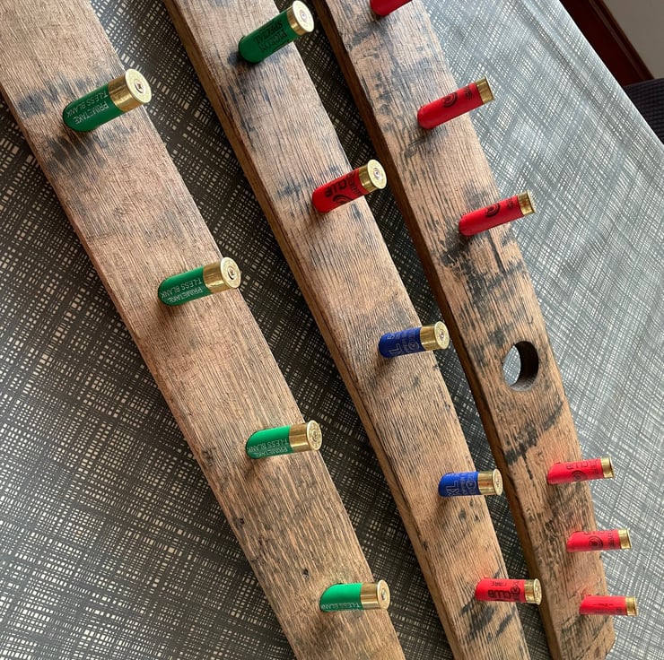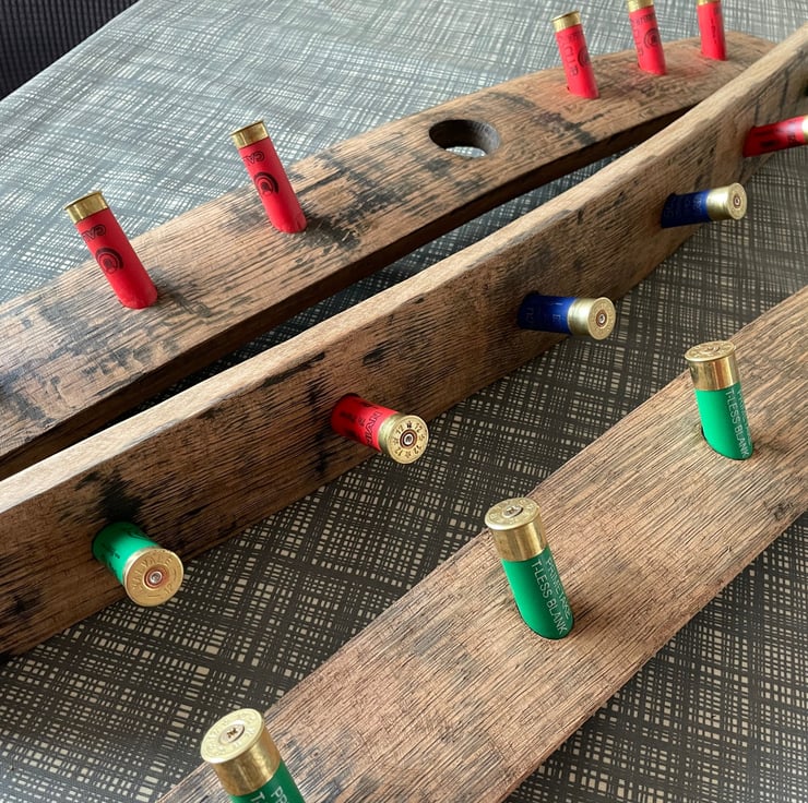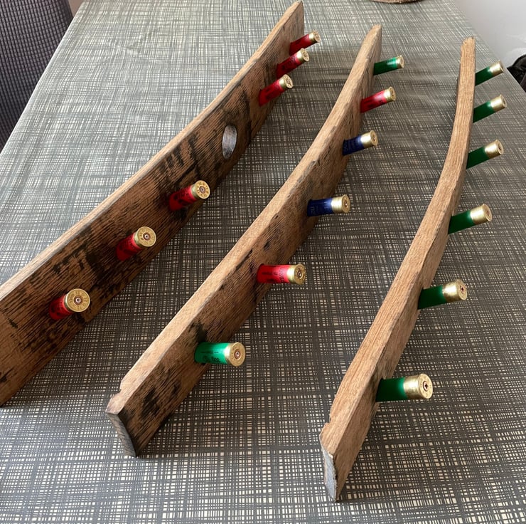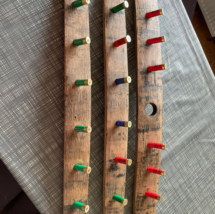 The Barrel Stave and Shotgun Cartridge Case Coat Hook is designed with 6 "coat hooks" but this can be altered to suit. There is also the option to have bung hole or plain stave versions. Choices of colours of "coat hooks" include Red, Blue, Green, Yellow, Purple, Sliver and Black. Colour combinations or single colour choices are available again please select when purchasing or contact me directly to discuss.