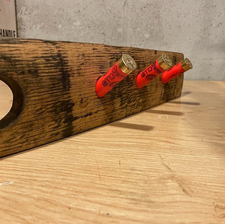 Whisky Barrel Stave and Shotgun Cartridge Case Coat Hook. Handcrafted here in the heart of whisky country in Aberdeenshire, Scotland.