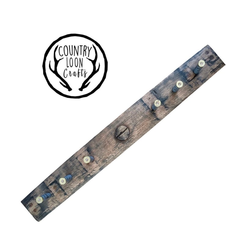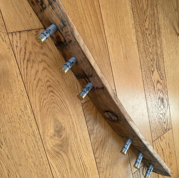 Salvaged oak whisky barrel staves steeped not only in whisky but also character. Each barrel stave is unique and their natural curve allows for the crafting of this beautiful Coat Hook. The lovely sweeping curve is formed from a single barrel stave planed and sanded to reveal the beautiful grain structure of the aged whisky soaked oak, while retaining some of the character gained during decades of use in whisky industry. Coupled with empty shotgun cartridge cases this is a neat way to reuse some waste materials as well as provide a quirky yet functional item for the home.