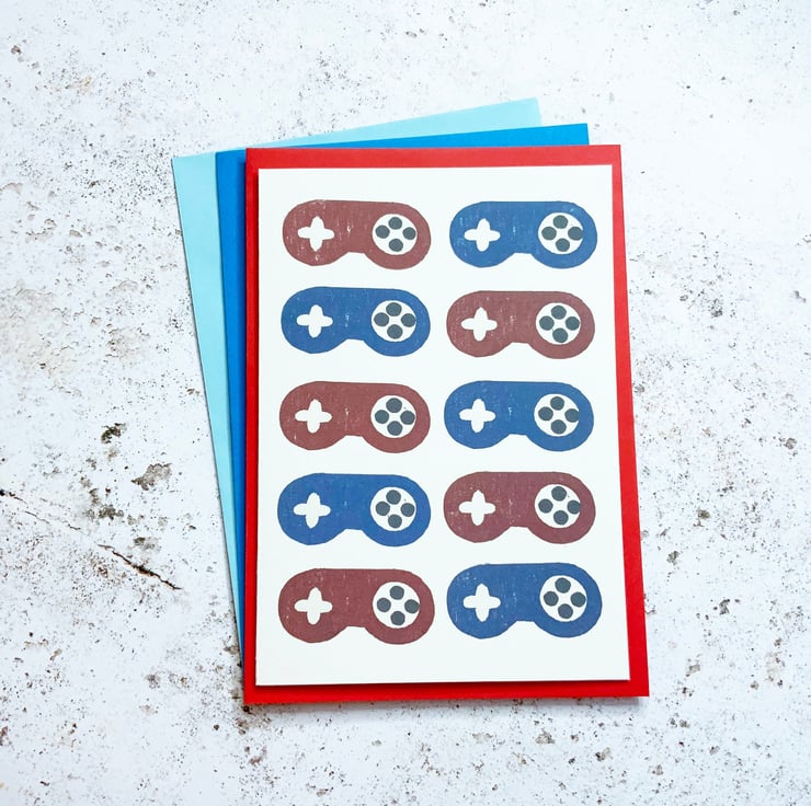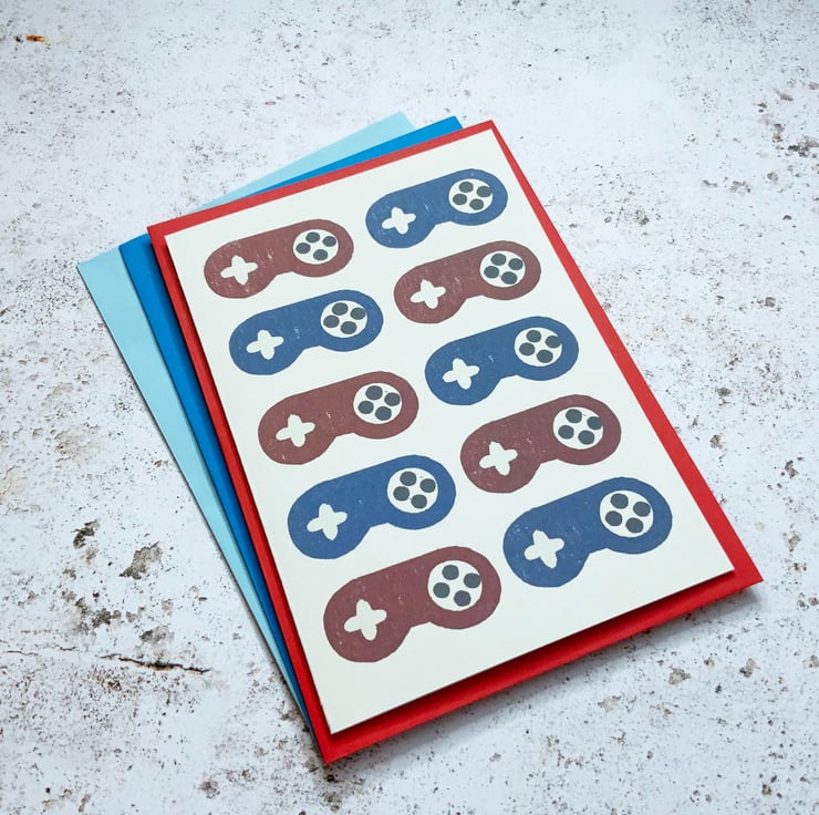 The design is created from a scan of an original lino cut print, digitally printed then cut and hand folded. For other gamer themed cards, take a look here: