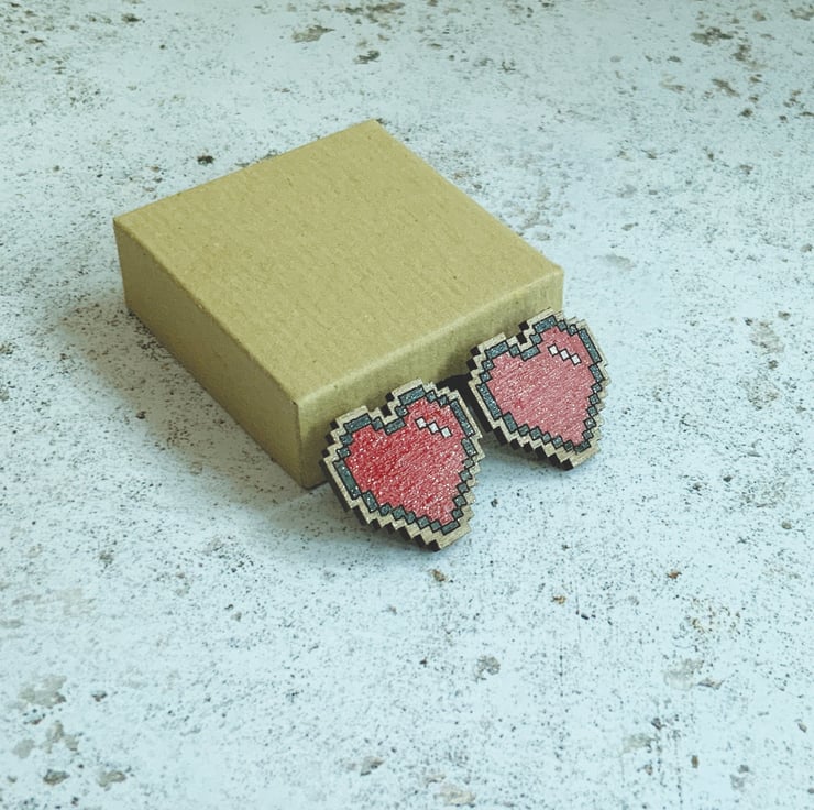 A pair of pixel heart earrings. They are hand painted walnut wood with sterling silver earring posts. For lovers of pixel jewellery.