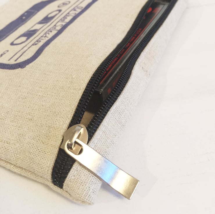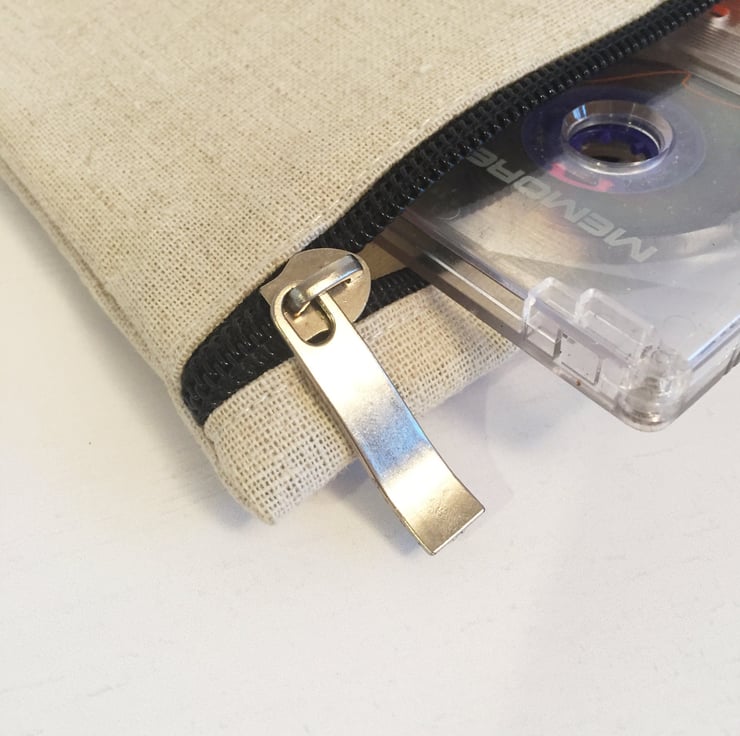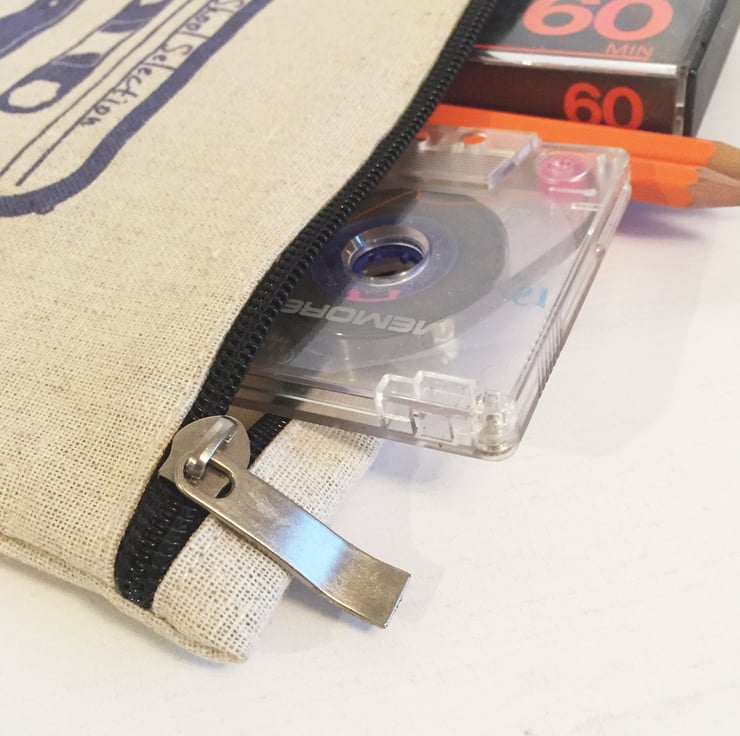 A mixtape Zip Pouch for music lovers. It's a silk screen print on hemp fabric with a sturdy zip pull.