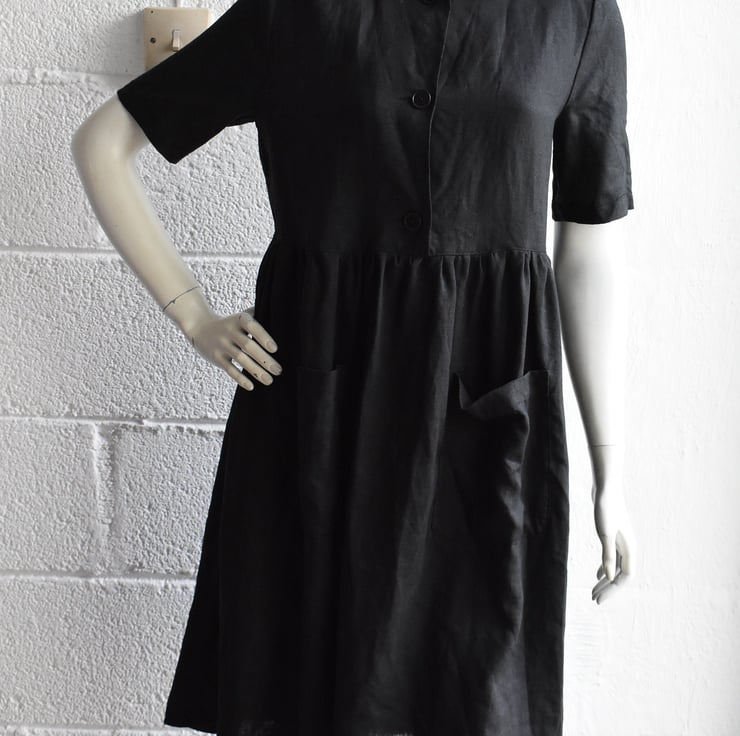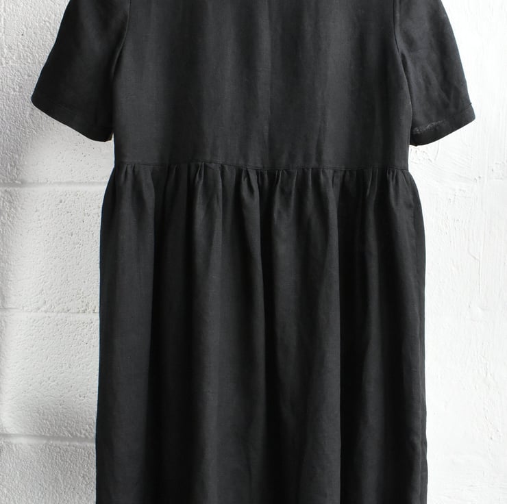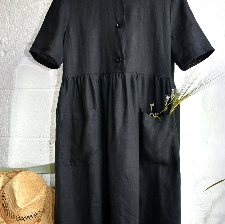 Super comfortable loose gathered dress with sleeve length just above the elbows, front neck to waist button fastening and two good sized pockets.