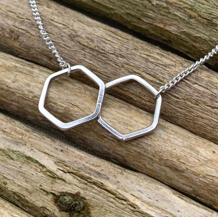 A handforged sterling silver hexagonal pendant inspired by the honeycomb pattern of a beehive.