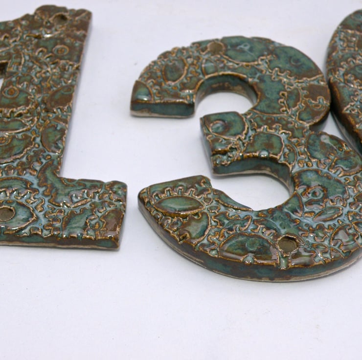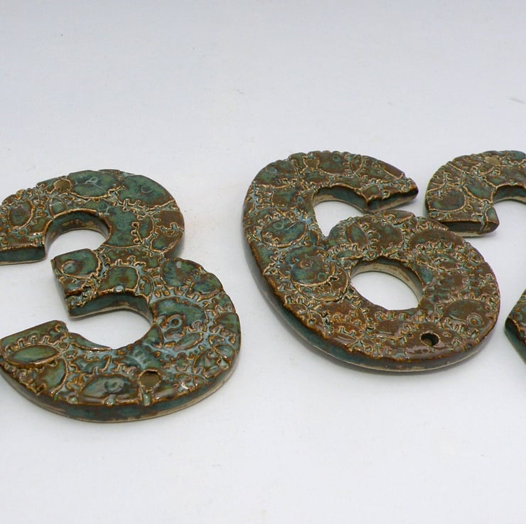 All numbers are available (photos are samples) ceramic house numbers .Fully hand made cut from slab of stoneware clay Coated with multilayer of high fire glaze