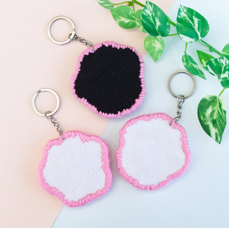 The punch needle part of the keyring measures approximately 6.5cm by 6.5cm. The chain and ring are 5cm long. There are one of each colour available.