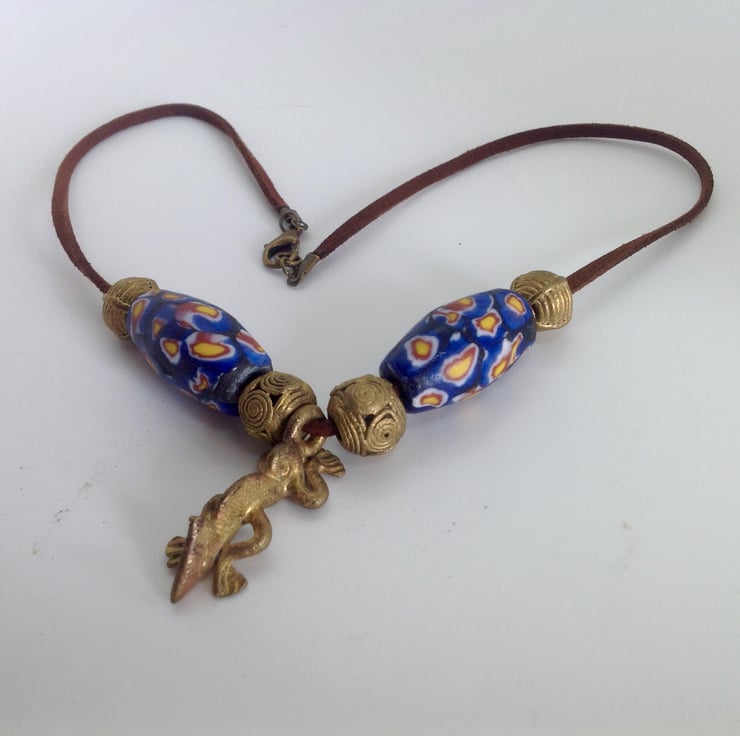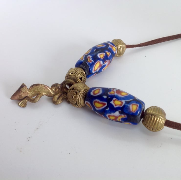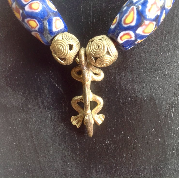 The brass pendant and beads are made in Ghana using the 'lost wax' method.