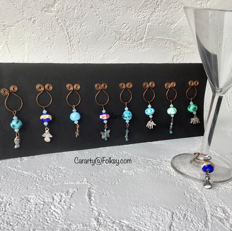Wine glass charms. Set of 8 individual wine glass charms. Make it easy for your guests to identify their own drink at parties and barbecues. Bronze spiralled ring holds a glass lampwork bead and a different Tibetan silver charm. Easy to pop on and off but dishwasher safe. The Charms are fish, angel, flower, bee, butterfly, dragonfly, hand made hand and elephant.