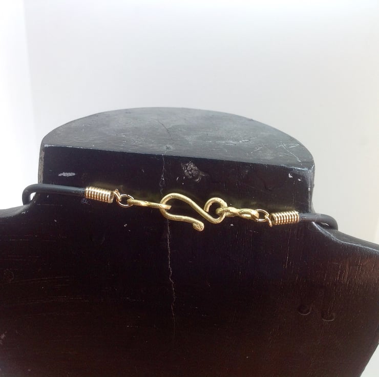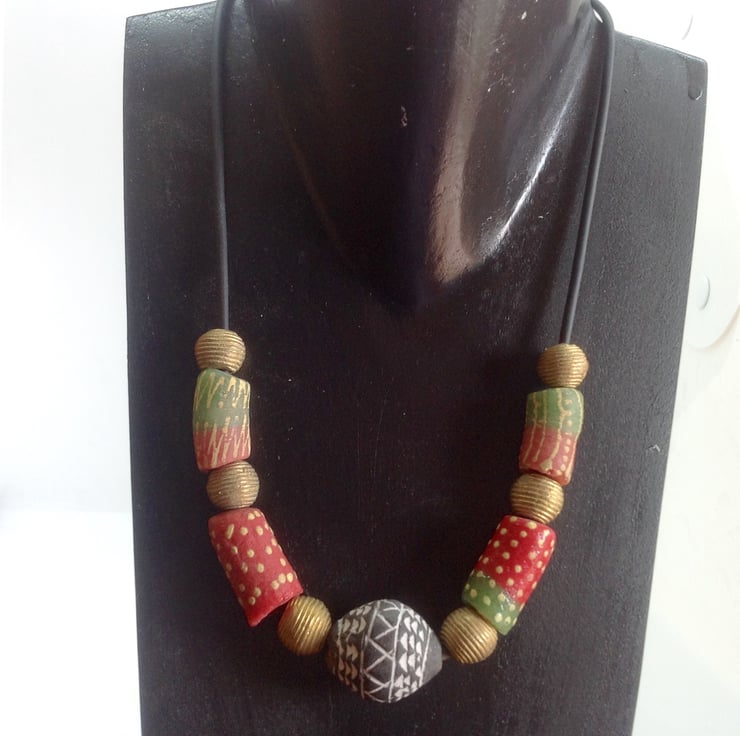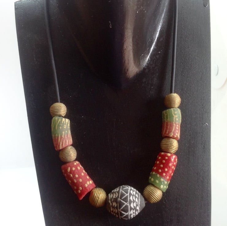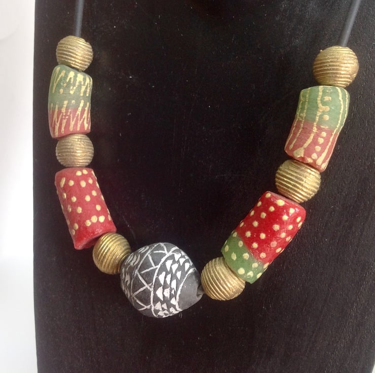 Background: The 'lost wax method of brass bead making means that each individual bead is unique. The long glass beads are called Krobo beads and have been made in Ghana for centuries in small quantities in local villages, - not in factories! The cord is made with rubber, but looks like leather. The clasp is also handmade in Ghana.