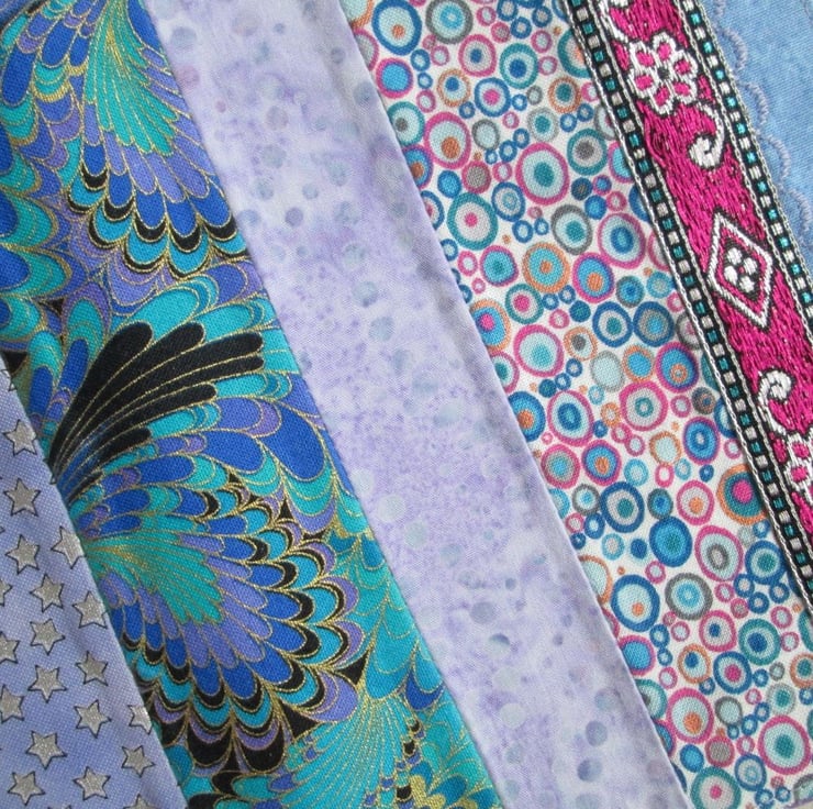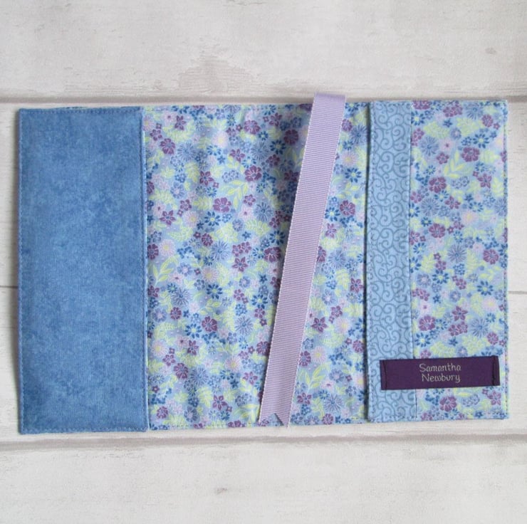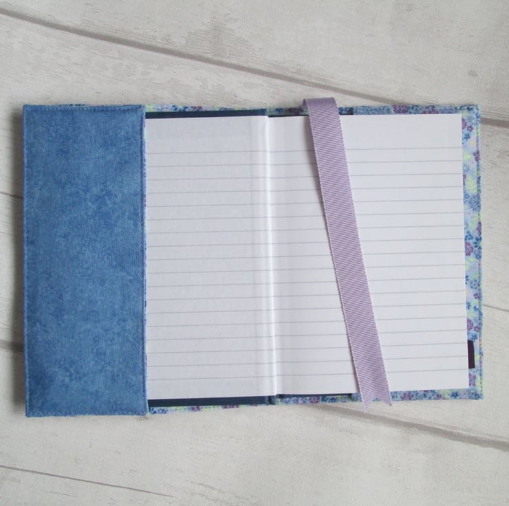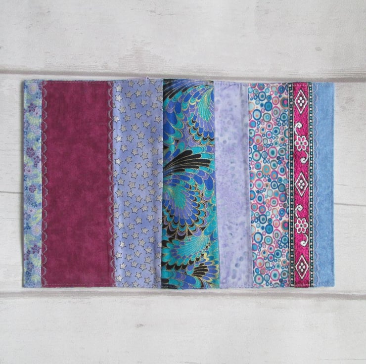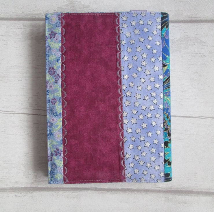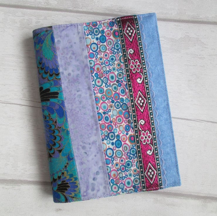 A one-of-a-kind patchwork notebook cover made from some lovely pieces from my scrap-box in shades of blue, pink and purple. Some of the pieces have metallic highlights and I've added a length of metallic floral braid and a little machine embroidery. The reusable cover also incorporates a ribbon place marker and comes complete with an A6 lined notebook.