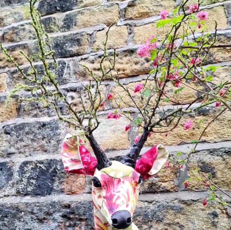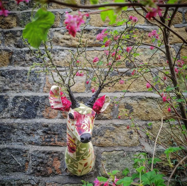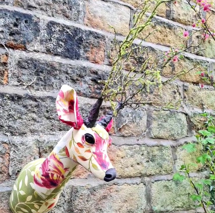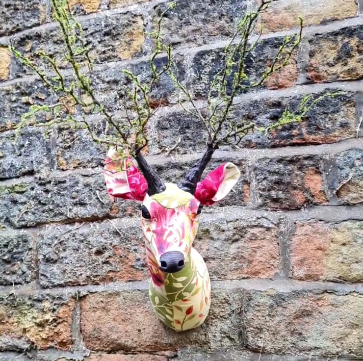 A lifesize faux deer head which I have cast myself and covered in hand stitched upholstery fabric. She has faux branches for antlers . The head is backed with felt and has a metal hanger to hang it on the wall. It is lightweight.