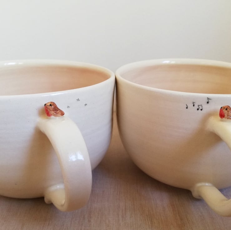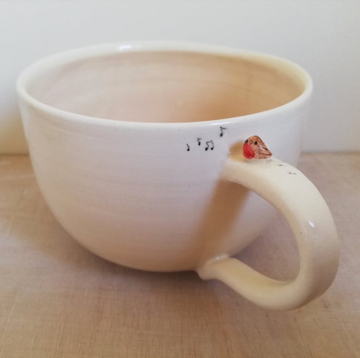 This cup was handthrown on my wheel and the handle was hand modelled and the handmade robin and footprints were applied. The piece was bisque fired, painted and clear glazed with food safe lead free glaze before the final firing.