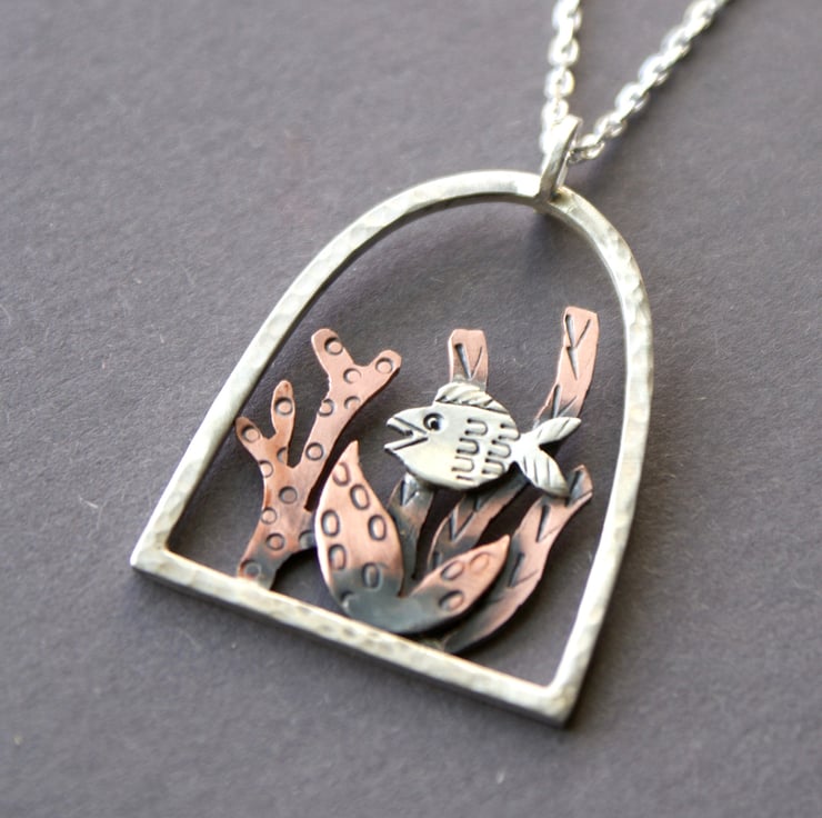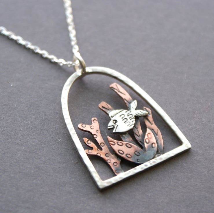 A gorgeous silver and copper necklace featuring an underwater scene with a little silver fish amongst some copper seaweed within a sterling silver arch. The metal has been textured, oxidised and rubbed back for depth. The circle is hammered for extra interest. The pendant is hung from an 18 inch sterling silver chain. (other lengths available, please ask)