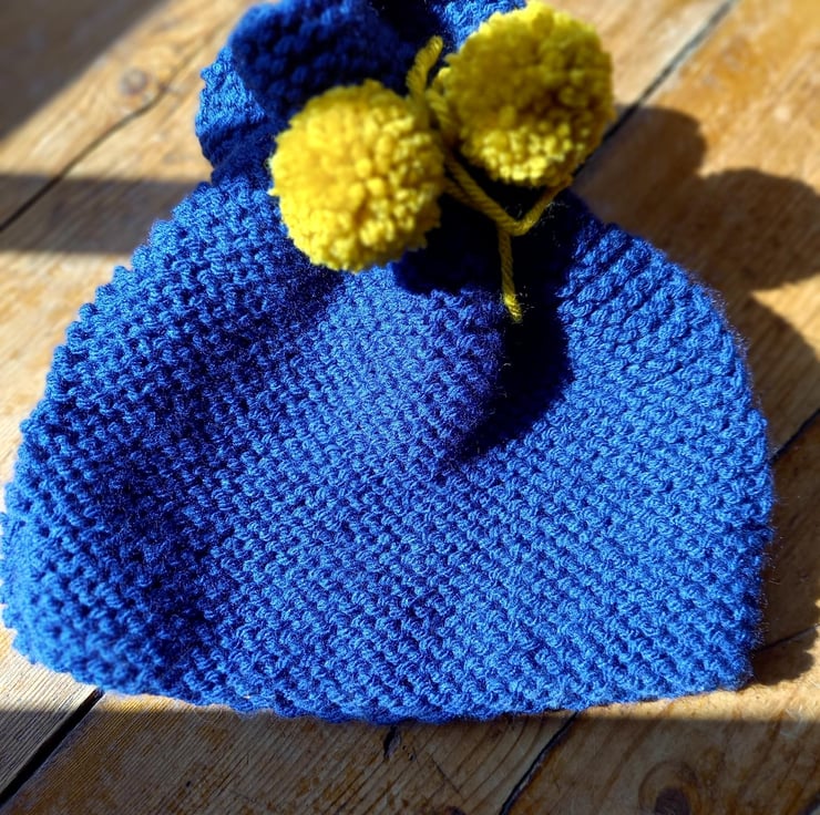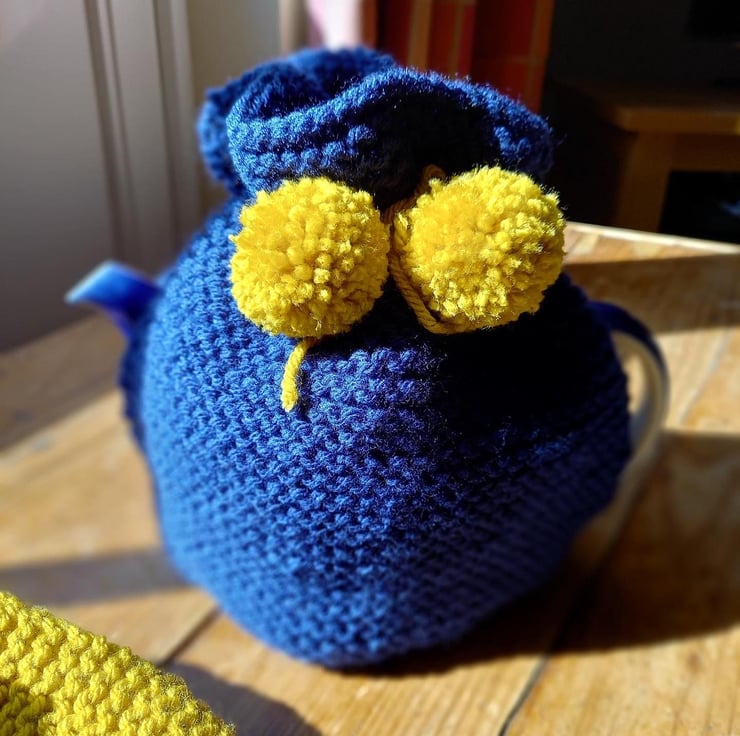 This tea cosy is hand knitted in chunky acrylic yarn. Colour is Navy with mustard yellow pom poms on one side of the tea cosy.