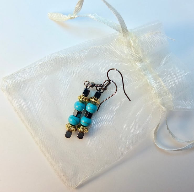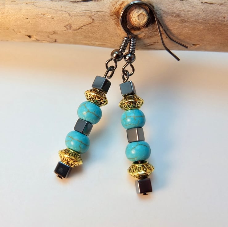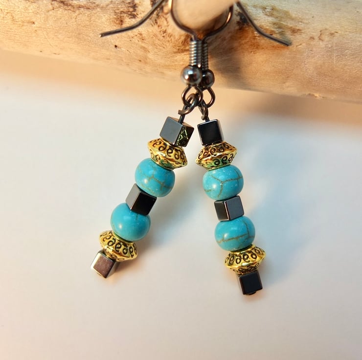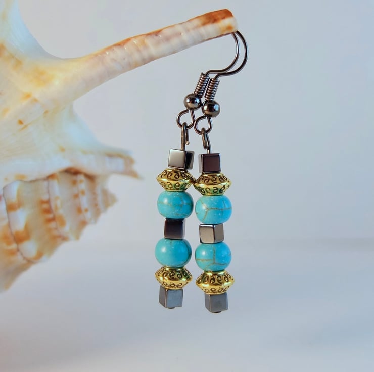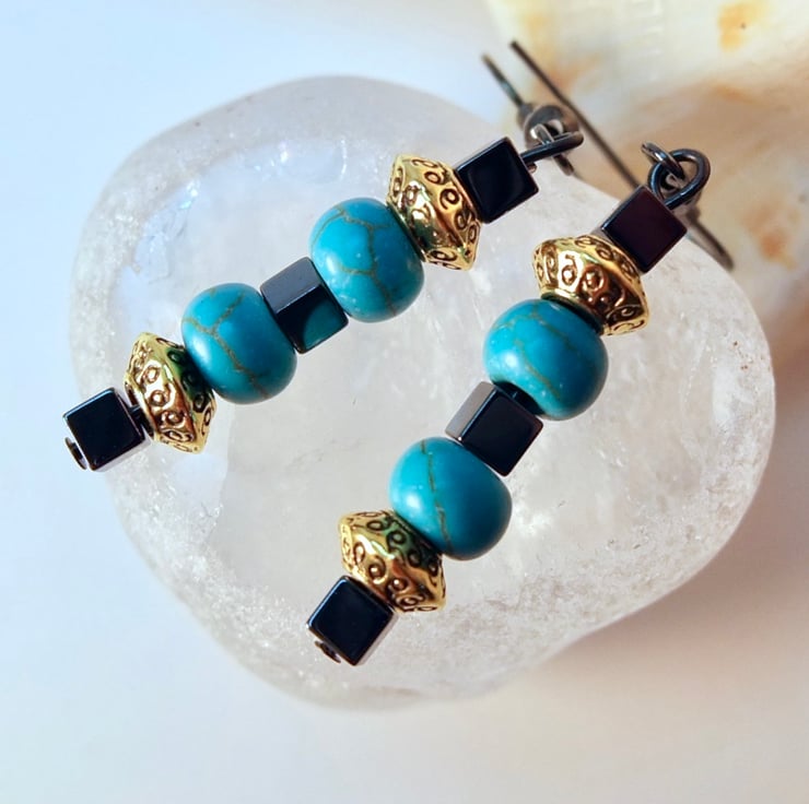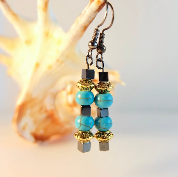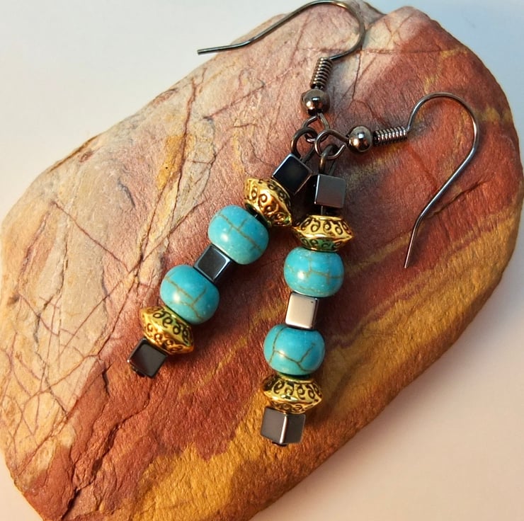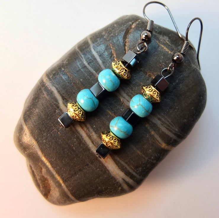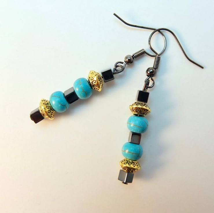 Striking earrings made of hematite 3mm cubes, 6mm reconstituted turquoise rondelles and ornate, Tibetan style (nickel and lead free) spacer beads in an antique gold finish.