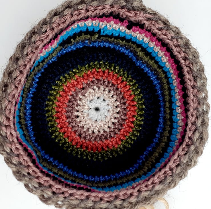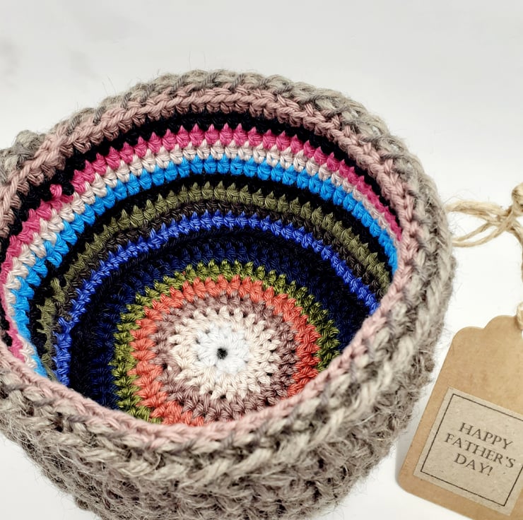 Thw stripes are on the inside of thus handy basket perfect for storing all manner of small items in the office or about the home. The inside is crocheted in cotton and features stripes in shades of brown, black, grey, blue, pink and beige. The outside is crocheted from a sturdy brown jute.