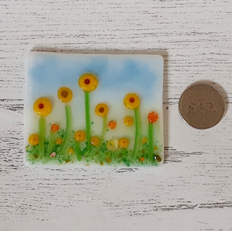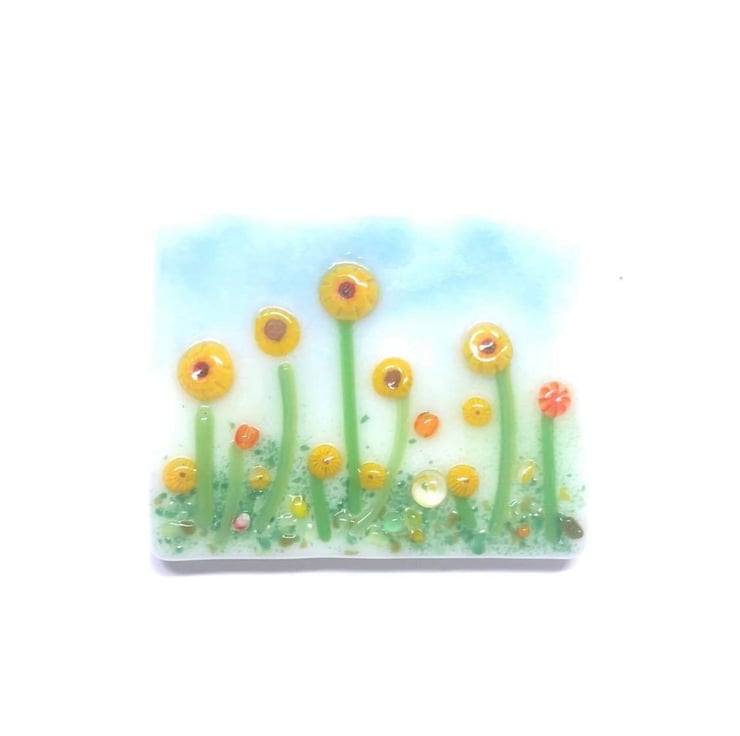 Fused glass fridge magnet in a cheerful yellow sunflower design.