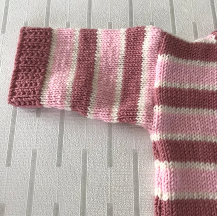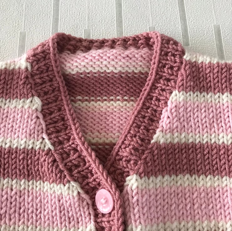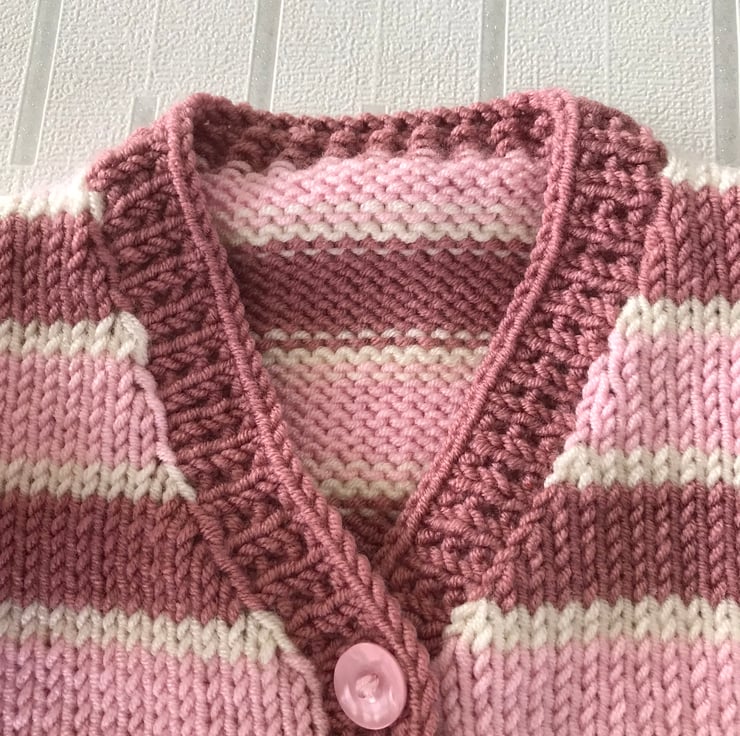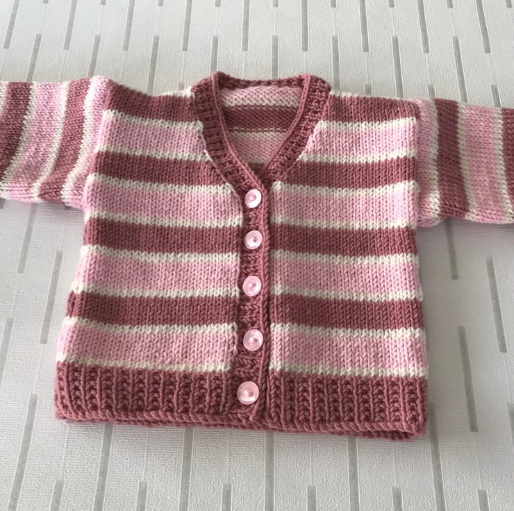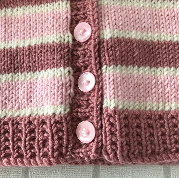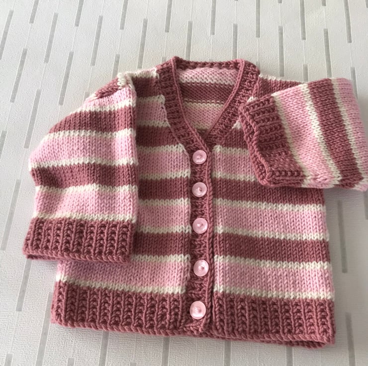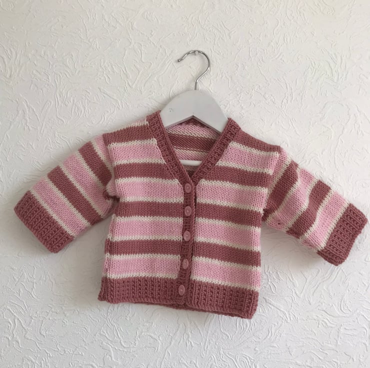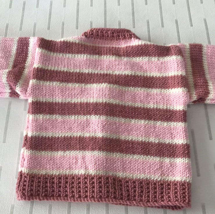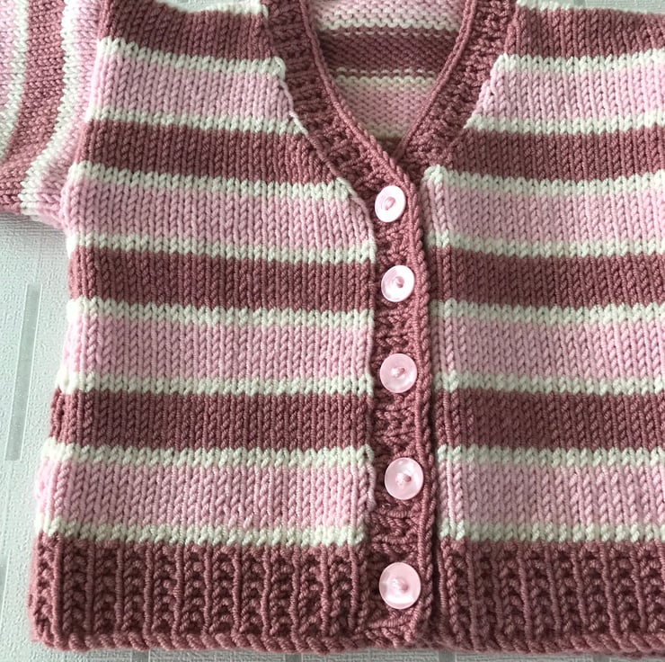 This striped cardigan is hand knitted in a soft acrylic yarn. It has broad stripes in two shades of pink and narrow stripes in cream. The rib, cuffs and front edging are worked in an attractive seeded rib. It has a v-neck and fastens at the front with five pink buttons.