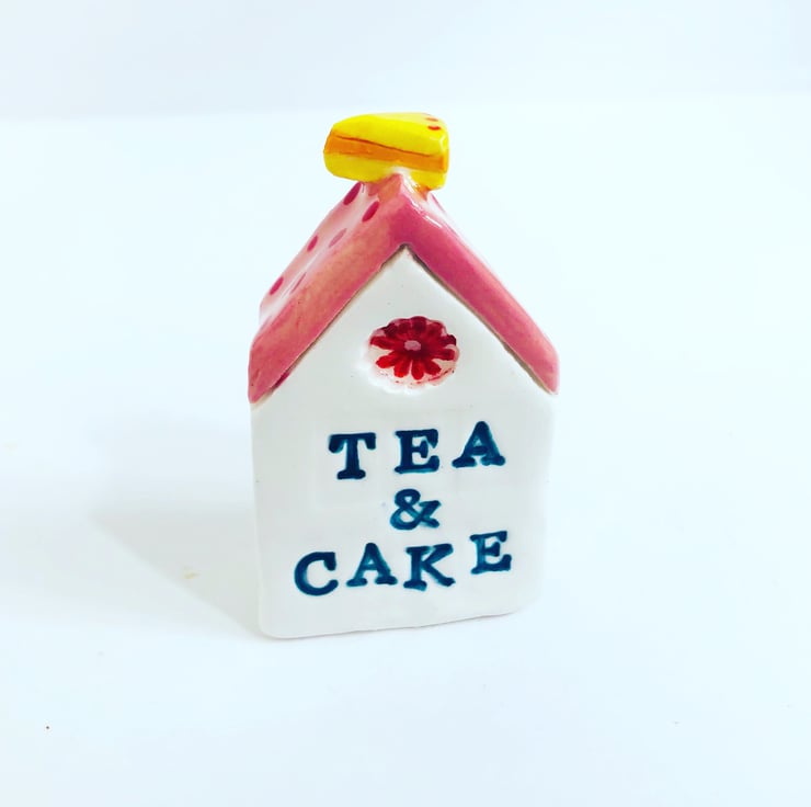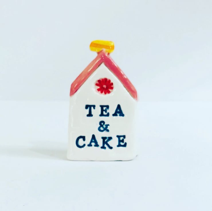 This little house has been lovingly handmade from porcelain clay. Designs such as a heart are pressed into the clay by a homemade stamp. Each house has its own theme and corresponding words. They are hand decorated with colourful underglazes and then fired in the kiln twice - the second firing adds the glossy transparent glaze. They look lovely on a shelf or windowsill and make great gifts! Measurements: 6cm high by 3cm wide