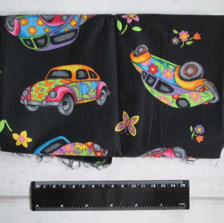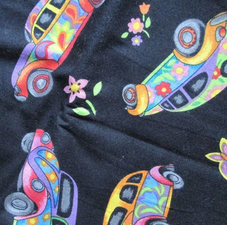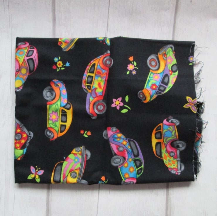 Half a metre of Nutex 'Herbie' quilting cotton featuring colourful 1960's flower power style beetle cars and sprigs of flowers on a plain black background. A fun, larger scale, retro style print - the cars measure approximately 10 cm from front to back.