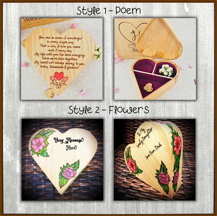 Both styles are written / drawn on the box by hand, with the method of Pyrography (wood burning). A small personalised message can be added on the inside of the lid, for both sides, at no extra cost.