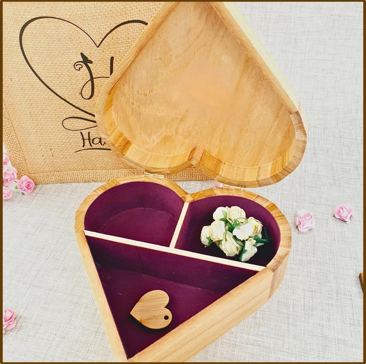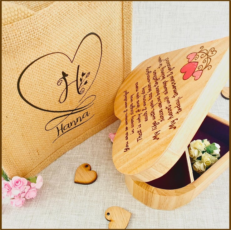 Heart shaped, wooden jewellery box, perfect for Valentine's Day, Christmas gift, Birthday present, or any special event you want to impress a loved one, like 5th Wood Wedding Anniversary, or even Mother's Day! It comes with a Jute Bag, personalised with Name & Monogram in a heart shaped image.