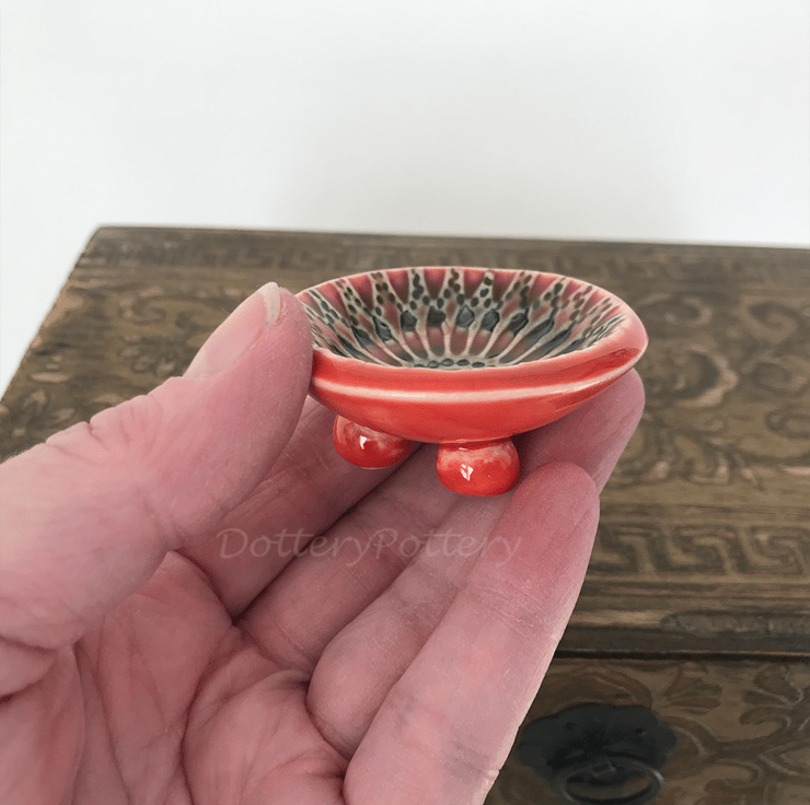 These little ceramic bowls are made from white earthenware clay and imprinted with pattern. Each pattern is handstamped and customised, so they are all slightly different. They have then been finished in bright, glossy glazes (food safe glaze) ready for you to use them how you like. Perfect as tealight holders, trinket dishes, incense cone bowls or even for teeny little dips! They have been fired in an electric kiln to 1100 degrees.They measure 6cm diameter x 3cm tall. They are quite tiny, so please check measurements if you are in doubt.