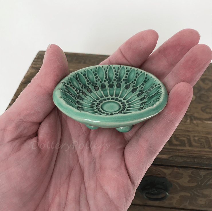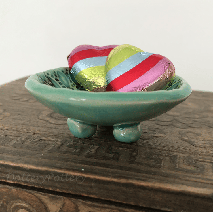 These little ceramic bowls are made from white earthenware clay and imprinted with pattern. Each pattern is handstamped and customised, so they are all slightly different. They have then been finished in bright, glossy glazes (food safe glaze) ready for you to use them how you like. Perfect as tealight holders, trinket dishes, incense cone bowls or even for teeny little dips! They have been fired in an electric kiln to 1100 degrees.They measure 6cm diameter x 3cm tall. They are quite tiny, so please check measurements if you are in doubt.